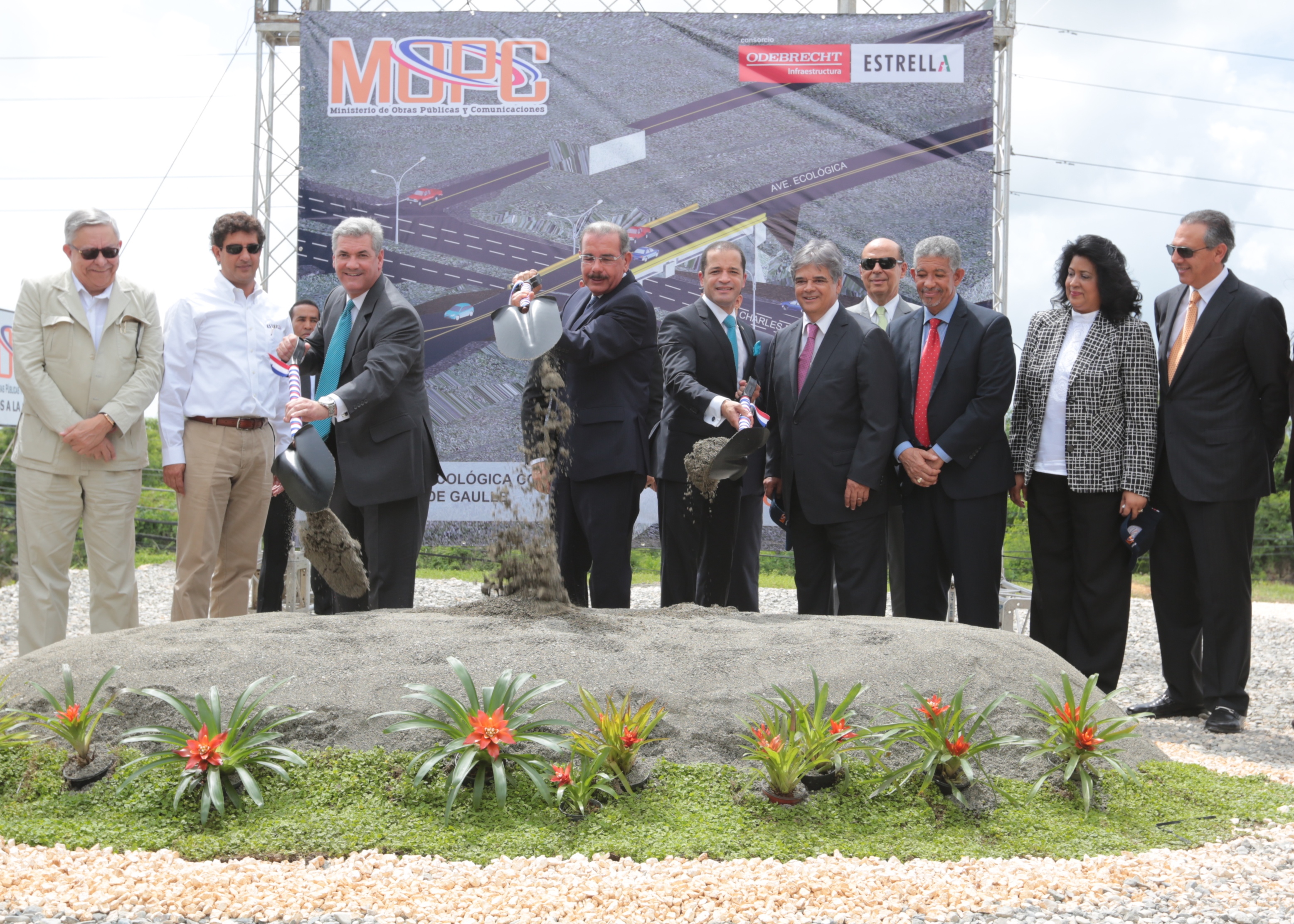 El presidente Danilo Medina, junto al ministros de Obras Públicas, Gonzalo Castillo y el alcalde de Santo Domingo Este, Juan de los Santos, quienes encabezan el acto del inicio de la construcción del Corredor Duarte 2. Figuran además, el ministros administrativo de la Presidencia, José Ramón Peralta; la senadora Cristina Lizardo, el embajador de Brasil, José Marcus Vinicius de Sousa; Marcos Cruz, de la empresa constructora Odebrecht, Manuel Estrella, de Acero Estrella y Pedro Delgado Malagón, de la empresa Tecnoamérica, entre otros invitados.