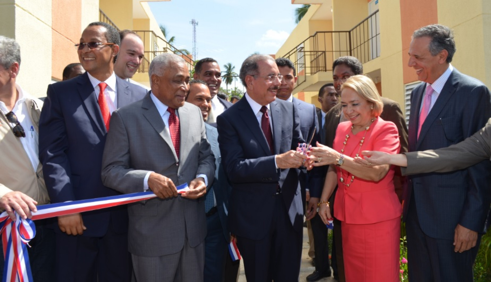 Momento del corte de cinta que deja inaugurado el nuevo proyecto habitacional, encabezado por el presidente Medina, la directora del INVI, arquitecta Alma Fernández, los ministros Administrativo de la Presidencia, José Ramón Peralta; de Industria y Comercio, José del Castillo Saviñón; los senadores de Barahona, Eddy Mateo; de Pedernales, Dionis Sánchez y los gobernadores de estas dos provincias, Pedro Peña y Ángel Zabala, respectivamente, entre otros invitados.