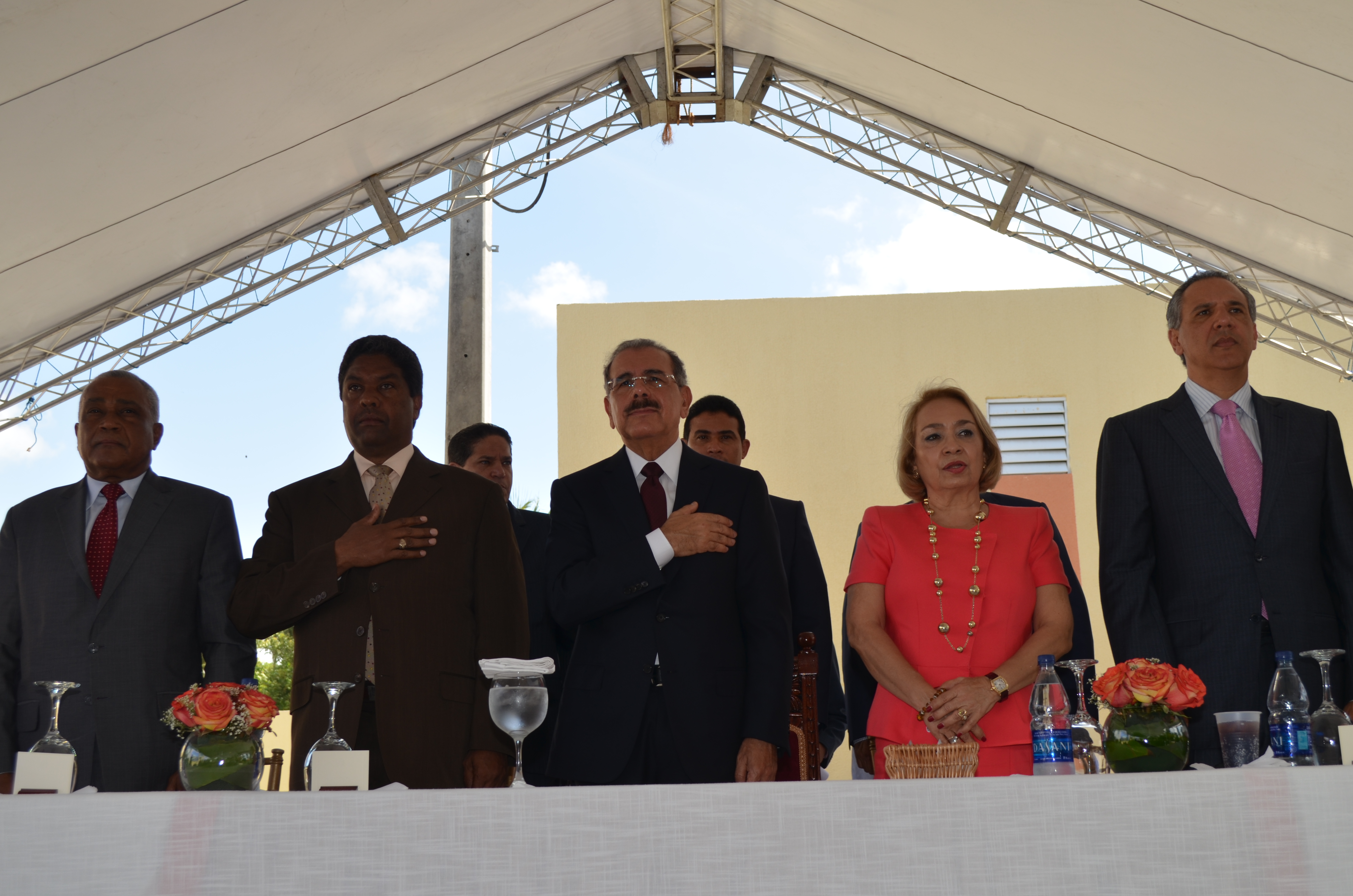Recepción de la inauguración del complejo habitacional, encabezado por el presidente Danilo Medina, la directora del INVI, arquitecta Alma Fernández; el ministros Administrativo de la Presidencia, José Ramón Peralta; los senadores de Barahona, Eddy Mateo; de Pedernales, Dionis Sánchez y los gobernadores de estas dos provincias, Pedro Peña y Ángel Zabala, respectivamente.