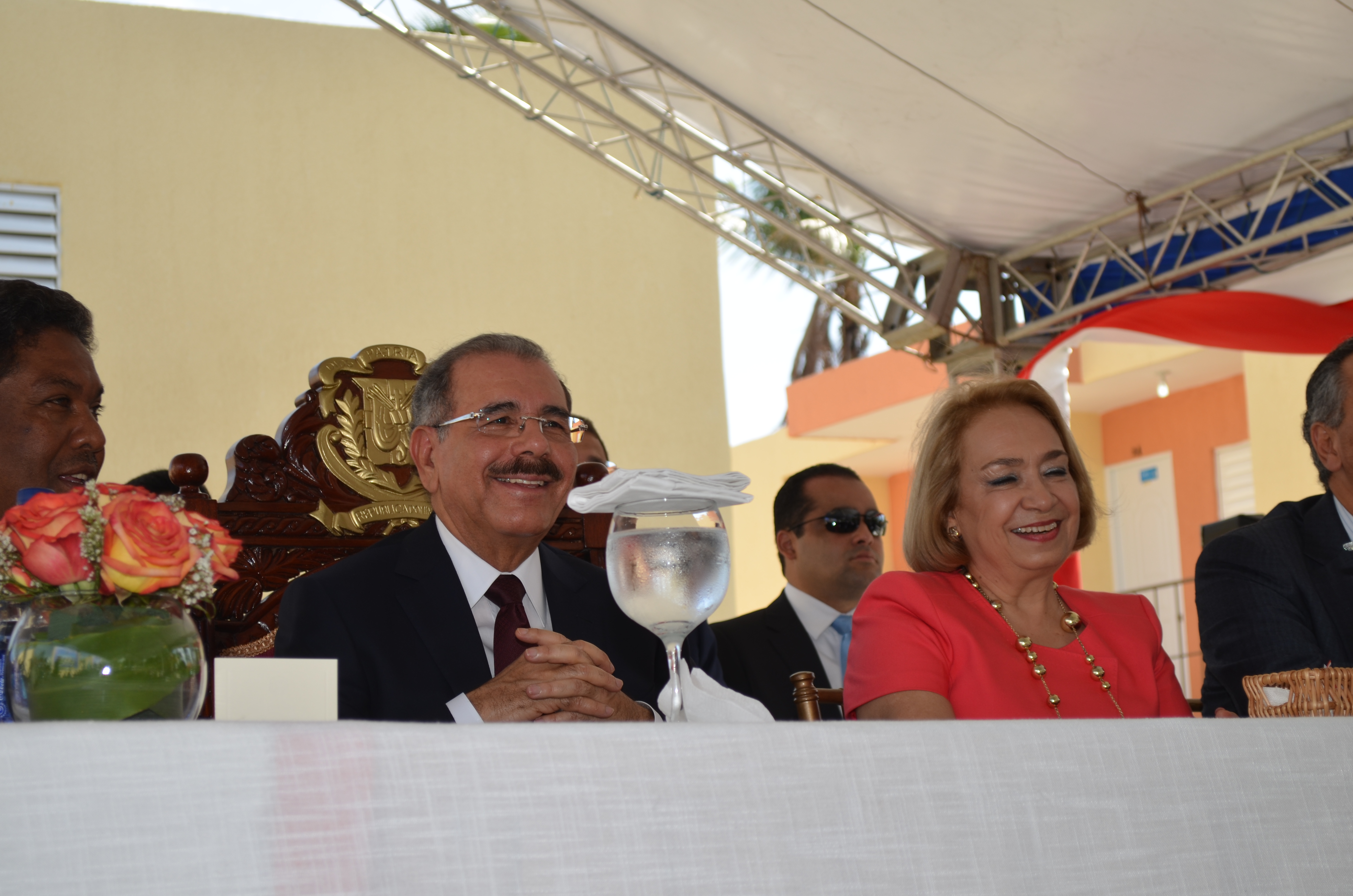 El presidente Danilo Medina, junto a la directora del INVI, arquitecta Alma Fernández sonríen animadamente, durante el desarrollo de la actividad.