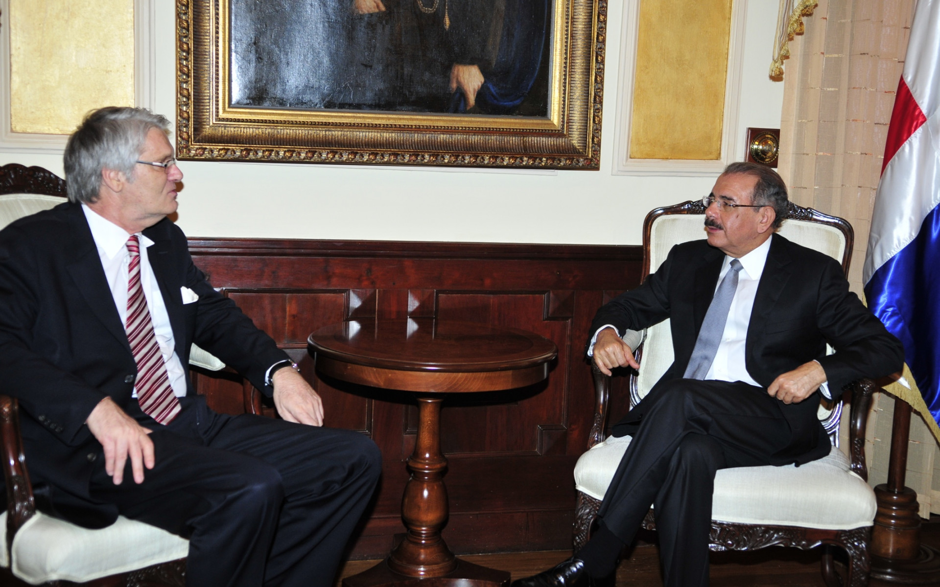 El presidente Danilo Medina y el embajador de Alemania en el país, Thomas C. Bruns, durante visita efectuada al Palacio Presidencial hoy, para despedirse luego de concluir su misión diplomática.
