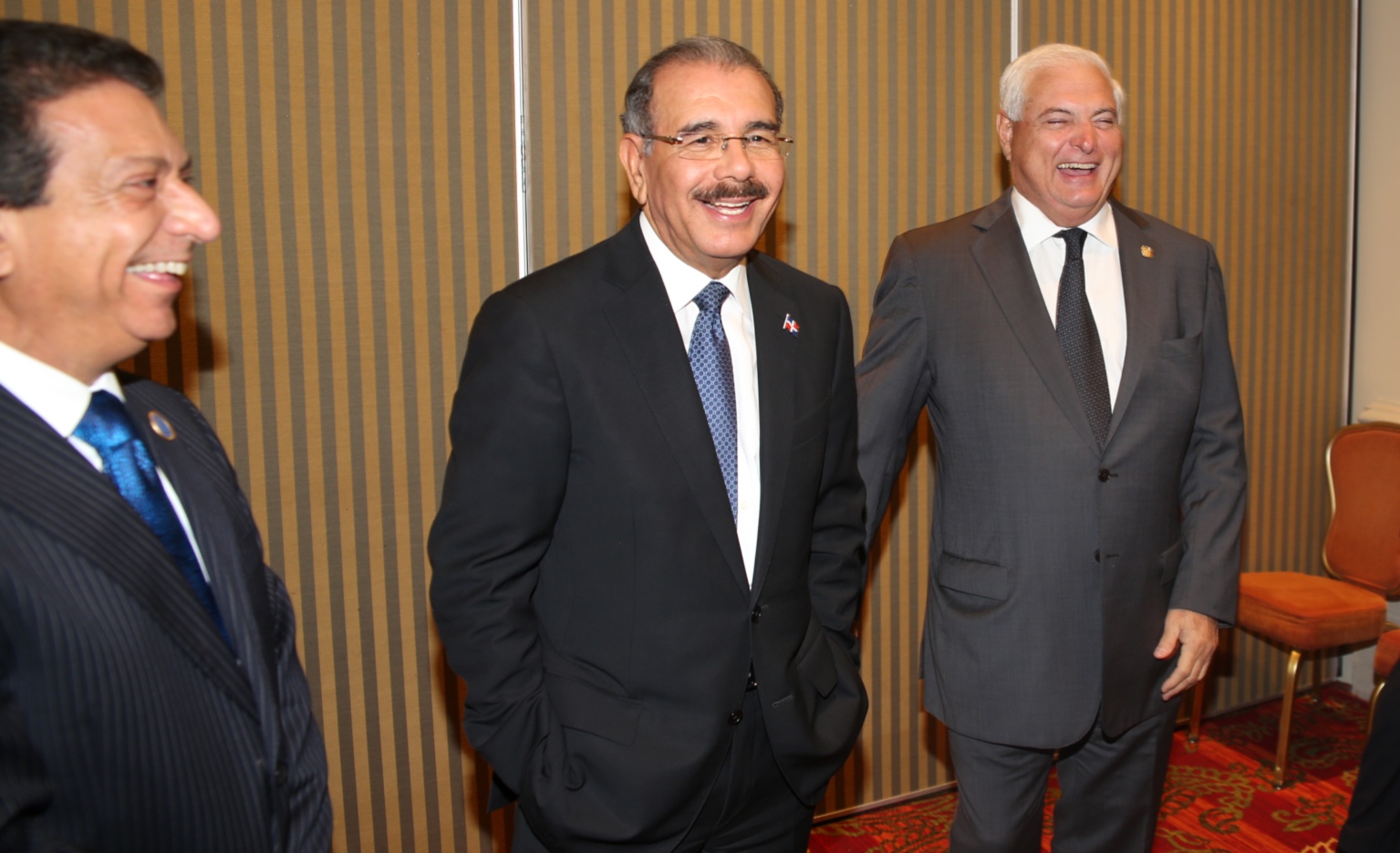 El presidente Danilo Medina, junto a Ricardo Alberto Martinelli Berrocal, presidente de Panamá, al conversar amenamente, durante su encuentro en la XLI Cumbre del SICA, celebrada en San José, Costa Rica.