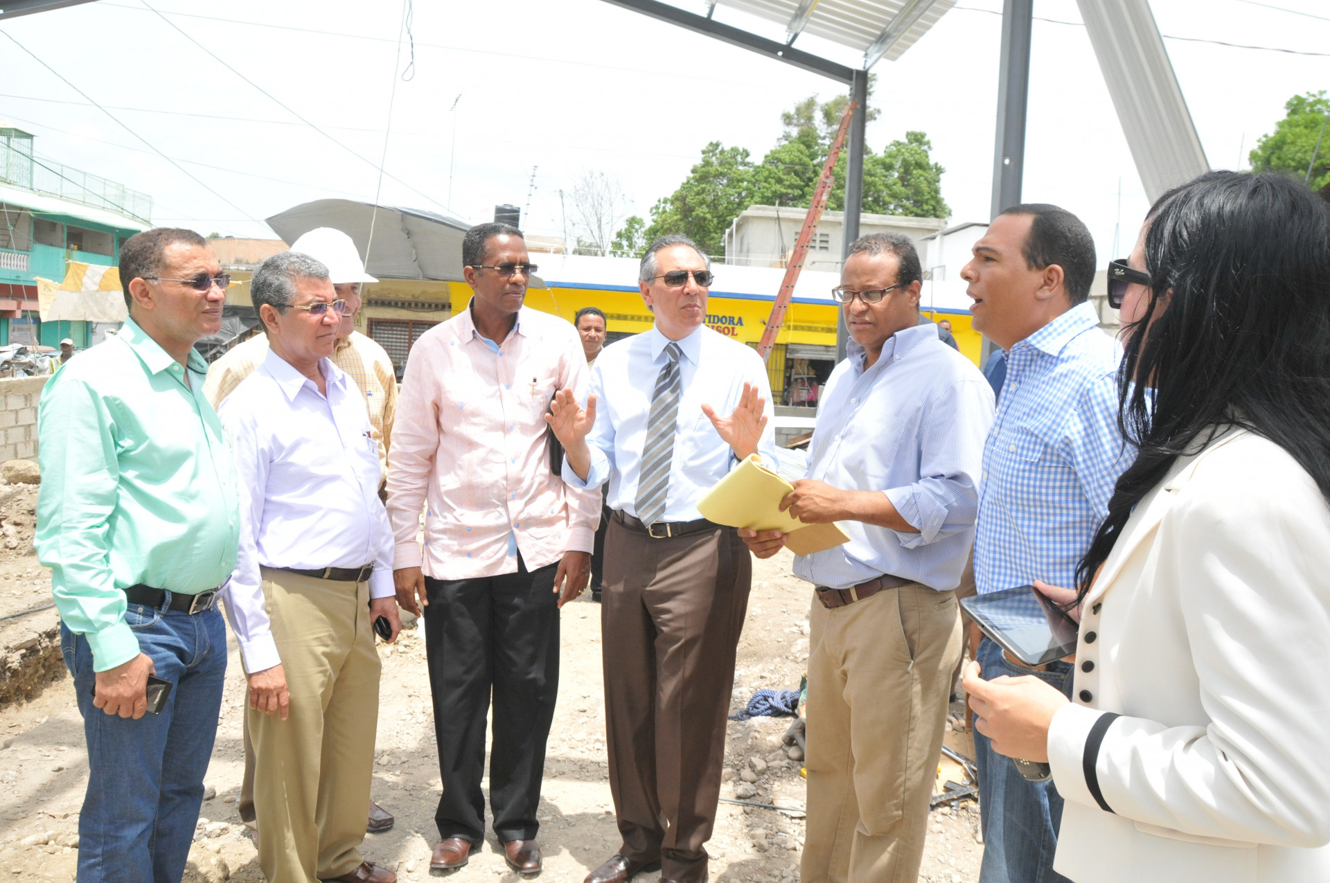 El ministro Administrativo de la Presidencia, José Ramón Peralta y sus acompañantes, reciben explicaciones del ingeniero Mario Almánzar, encargado de los trabajos de reconstrucción del mercado de Azua, afectado por un incendio que destruyó 16 establecimientos comerciales y que el Presidente de la República ordenó reconstruir.