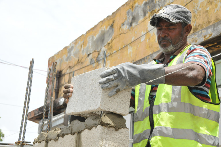 Obreros de la construcción, al realizar los trabajos prometidos por el señor presidente Danilo Medina, sobre la reconstrucción del mercado de Azua, visitados hoy por la Comisión de Seguimiento.