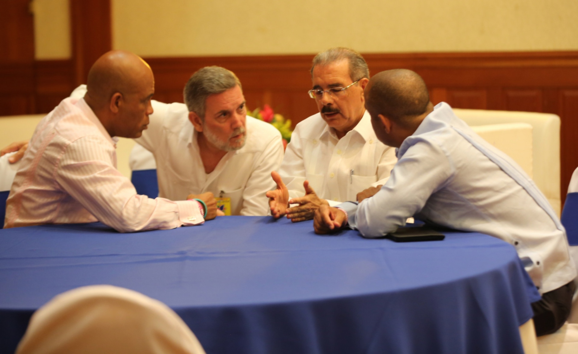 El presidente Danilo Medina, junto a Roberto Rodríguez Marchena, director general de comunicación de la Presidencia (sentados al centro), durante un breve encuentro solicitado por el presidente de Haití, Michel Martelly y el primer ministro de esa nación, Laurent Lamothe, para tratar asuntos sobre las relaciones comerciales entre ambos países, en la VIII Cumbre de Petrocaribe, efectuada en la ciudad de Managua, Nicaragua.