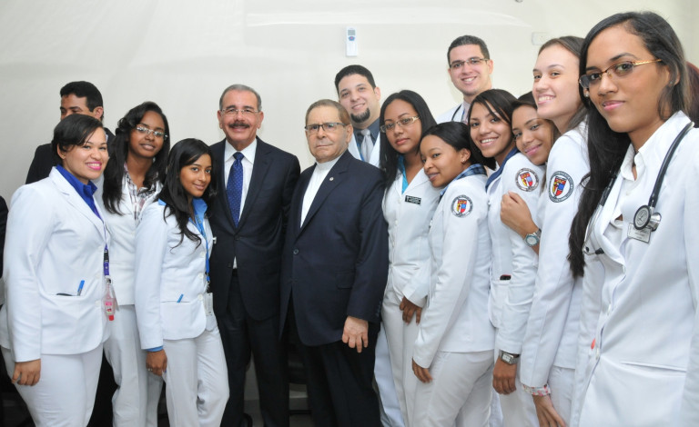 El presidente Danilo Medina y monseñor Agripino Núñez Collado, rector de la PUCMM, posan junto a médicos que laboran en el Hospital Juan XXIII, de la ciudad de Santiago.