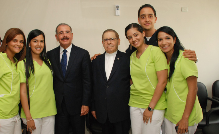 Presidente Medina y monseñor Agripino Núñez Collado, rector de la PUCMMA, posan para la prensa junto a personal del hospital Juan XXIII, durante recorrido por sus instalaciones.