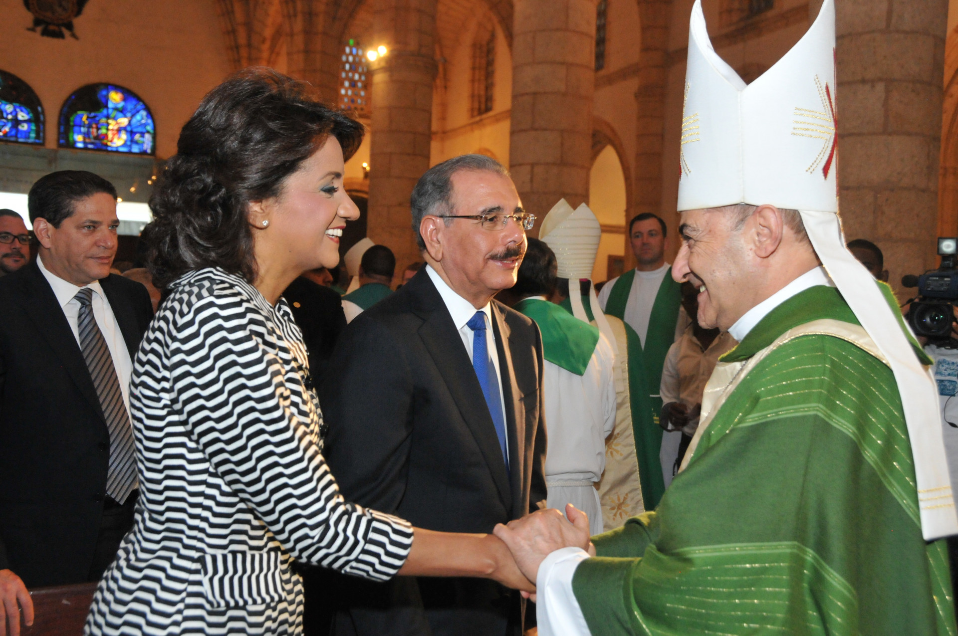 El presidente Danilo Medina y esposa Cándida Montilla de Medina, primera dama de la República, al intercambiar saludos altos dignatarios de la iglesia católica, luego de finalizada la misa en honor al papa Francisco, en la Catedral Primada de América.