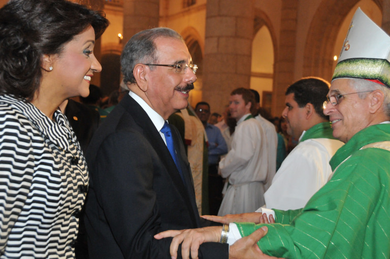 El presidente Danilo Medina y esposa Cándida Montilla de Medina, primera dama de la República, intercambian saludos con dignatarios de la iglesia católica, luego de finalizada la homilía en honor al papa Francisco, en la Catedral Primada de América.