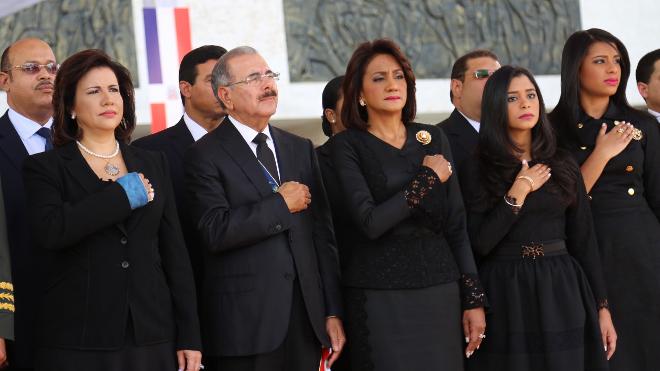 El presidente Danilo Medina, acompañado de su esposa, la primera dama Cándida Montilla de Medina, y sus hijas Candy, Vanessa y Ana; y la vicepresidenta Margarita Cedeño de Fernández; a su llegada a la explanada frontal del Congreso Nacional, donde recibió los honores militares de estilo a su investidura previo a su discurso de Rendición de Cuentas.