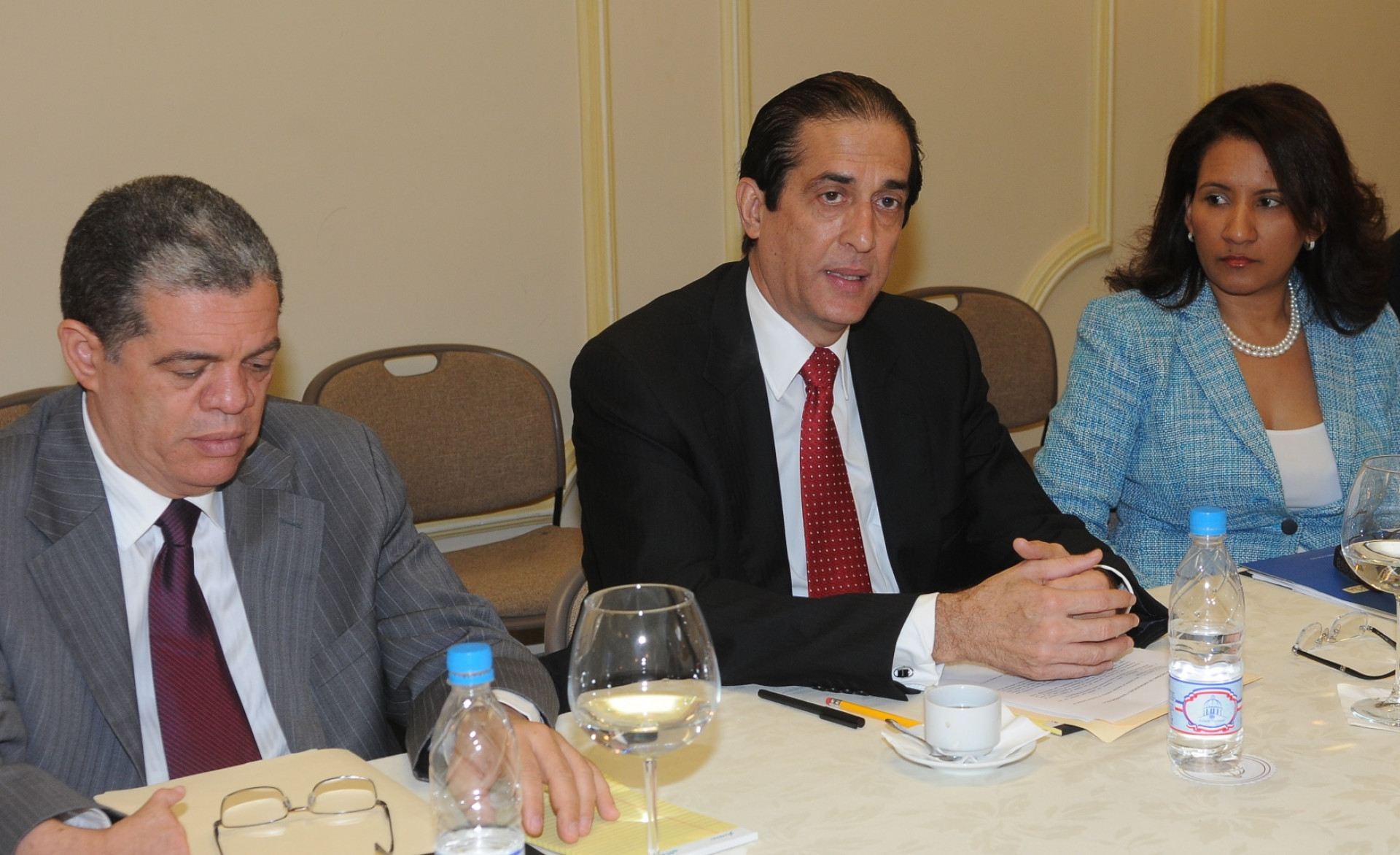 Ministro de la Presidencia, Gustavo Montalvo y Carlos Amarante Baret, director del Instituto Dominicano de las Telecomunicaciones (INDOTEL), al encabezar la reunión con directivos de las empresas prestadoras de servicios de telecomunicaciones del país, Claro, Orange, Viva, Tricom y Wind Telecom, sobre tema del Sistema Integrado de Emergencias y Seguridad 9-1-1