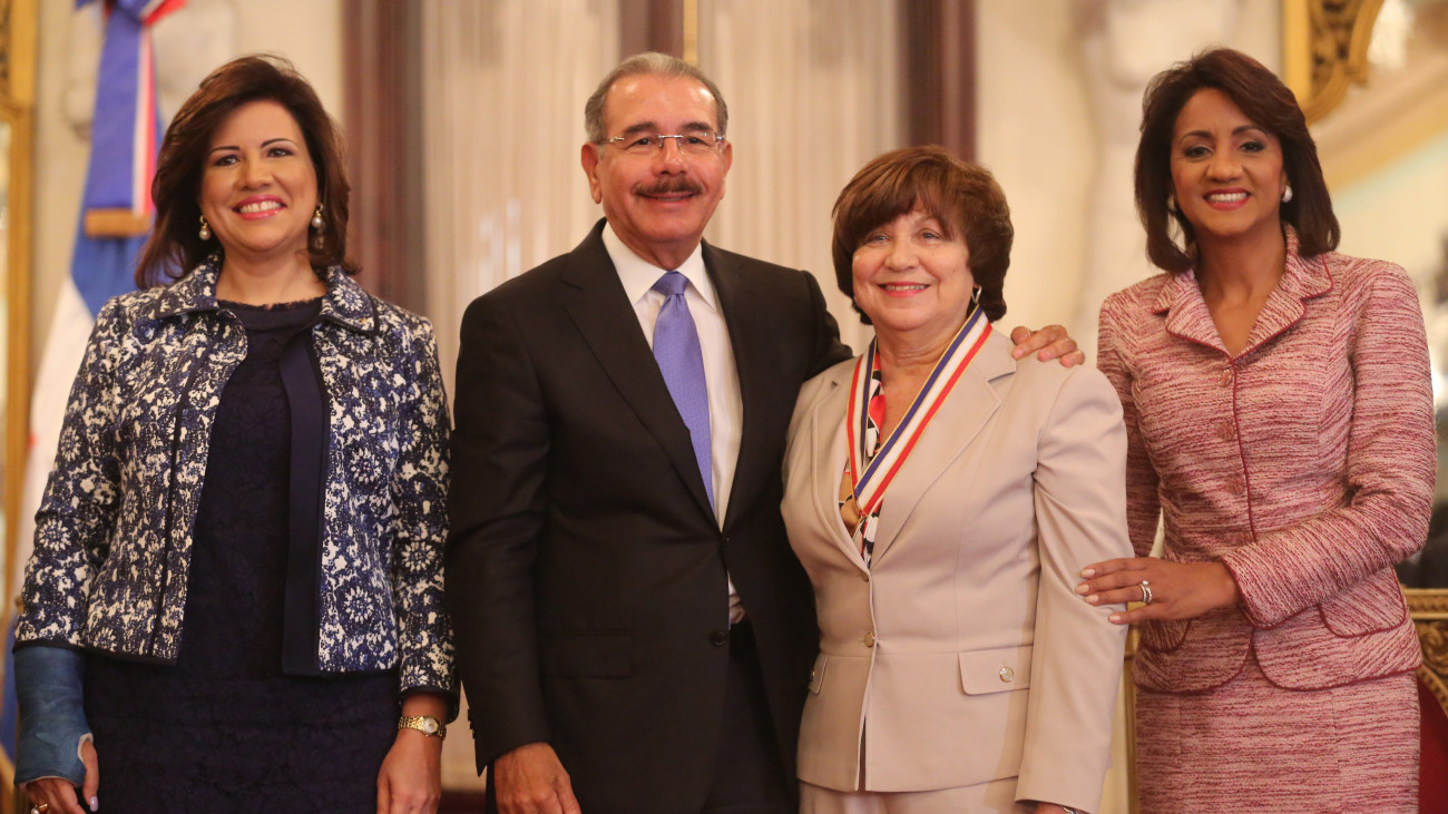 El presidente Danilo Medina entregó el galardón, en el renglón "Ciencias de la Salud", a Altagracia Esperanza Esquea de Cumberbatch durante el acto de la Medalla al Mérito de la Mujer. Le acompañan, la primera dama Cándida Montilla de Medina, la vicepresidenta Margarita Cedeño de Fernández.
