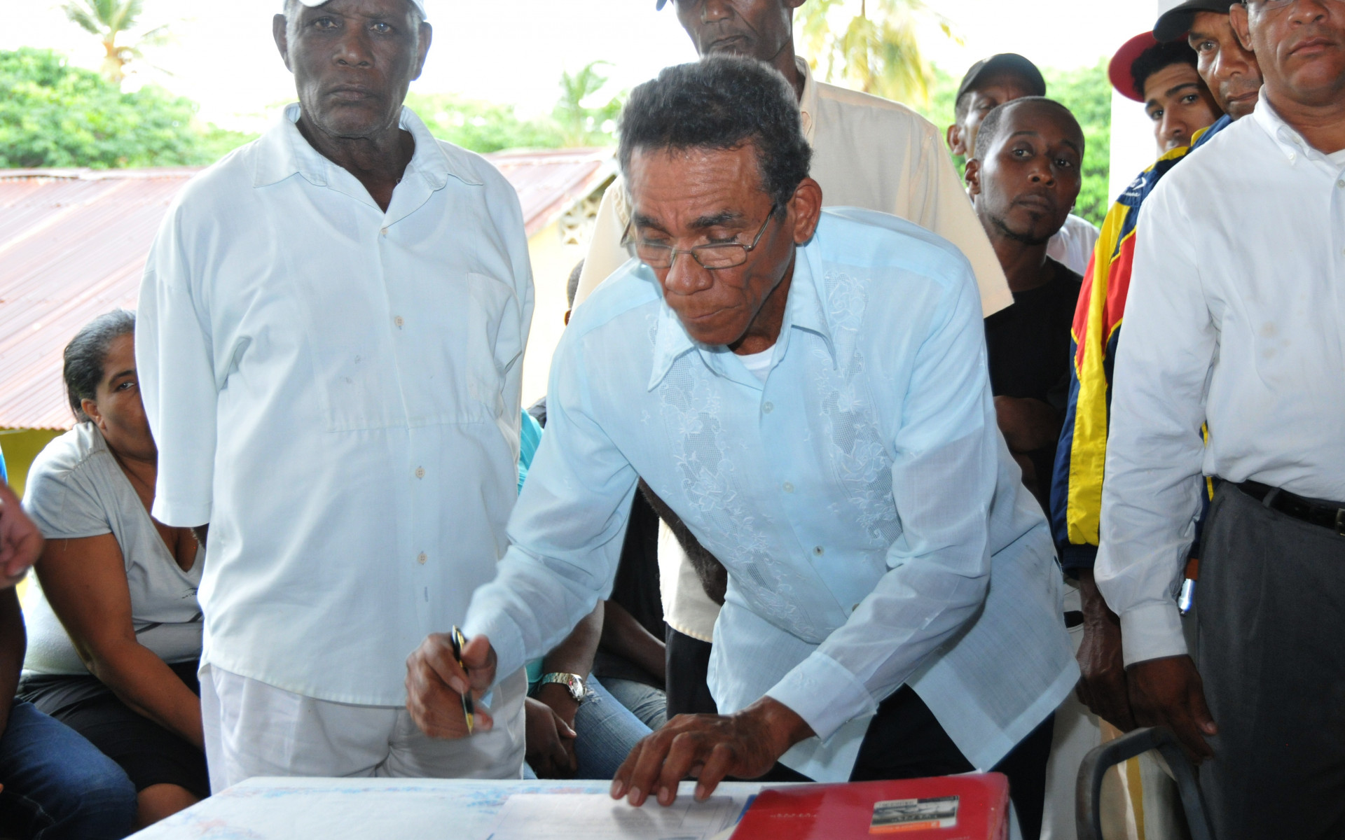 Señor Juan Carlos, dirigente de la Junta de Asociaciones Campesinas de Samaná (JACASA), se dispone a firmar como recibido el cheque entregado por el ministro administrativo de la Presidencia, José Ramón Peralta en representación del Gobierno, y el director del Fondo para el Desarrollo Agropecuario (FEDA), Antonio López.
