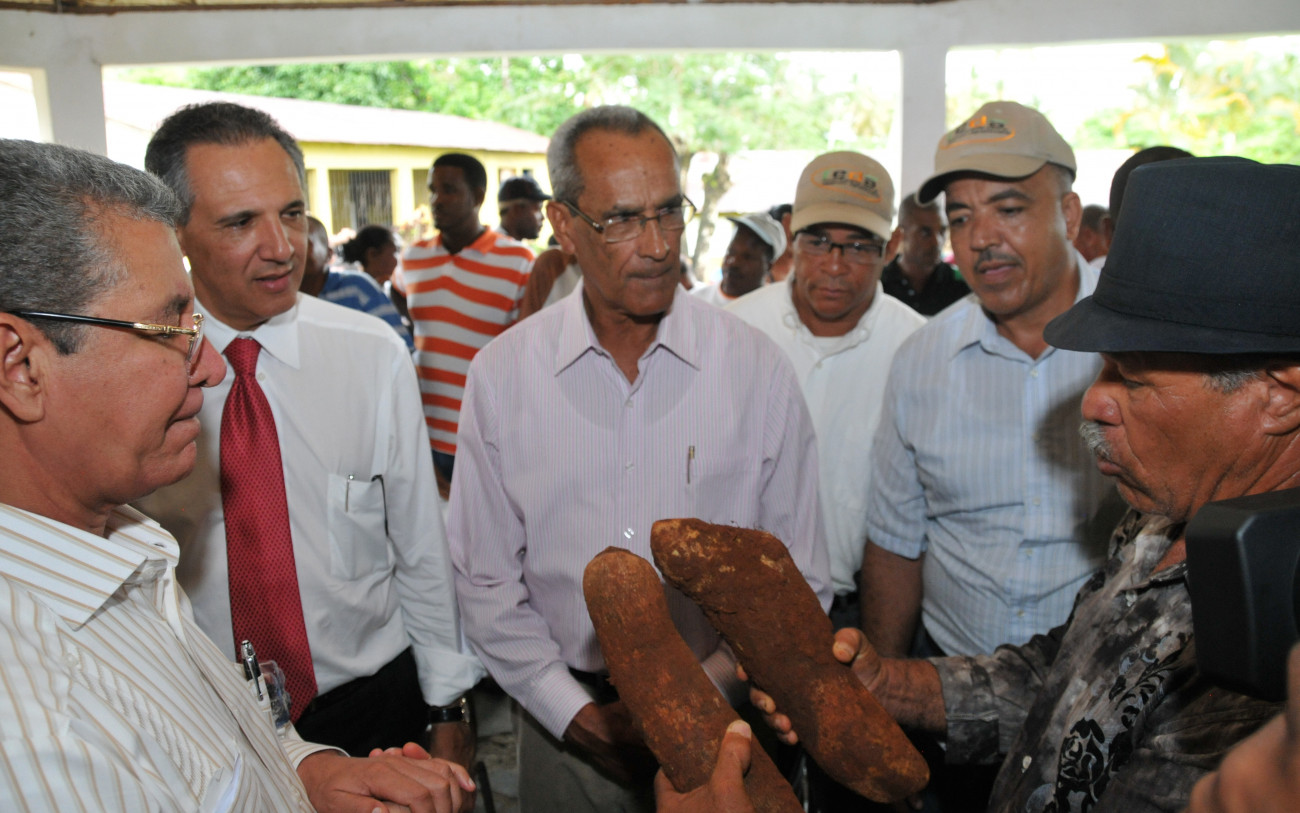 El presidente de la Cooperativa de Productores de Ñame de La Pascuala, que agrupa a unos 1,300 productores que serán beneficiados con el crédito oficial, presenta muestra del cultivo al ministro Administrativo de la Presidencia, José Ramón Peralta, y el director del Fondo para el Desarrollo Agropecuario (FEDA), Antonio López.