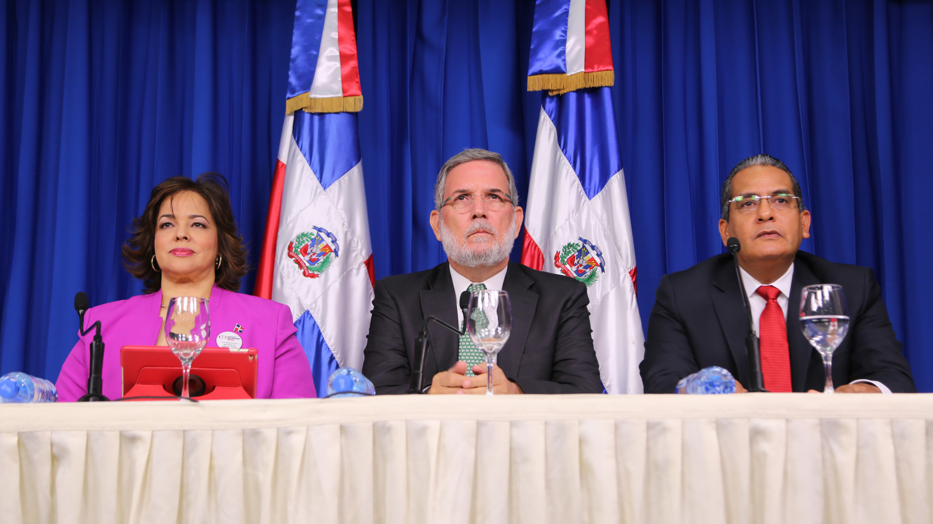 El portavoz del Gobierno y director general de Comunicación de la Presidencia, Roberto Rodríguez Marchena, acompañado de Yokasta Guzmán, directora de Contrataciones Públicas; y Alberto Perdomo Piña, tesorero Nacional; durante la rendición de cuentas ampliada en materia de Transparencia.