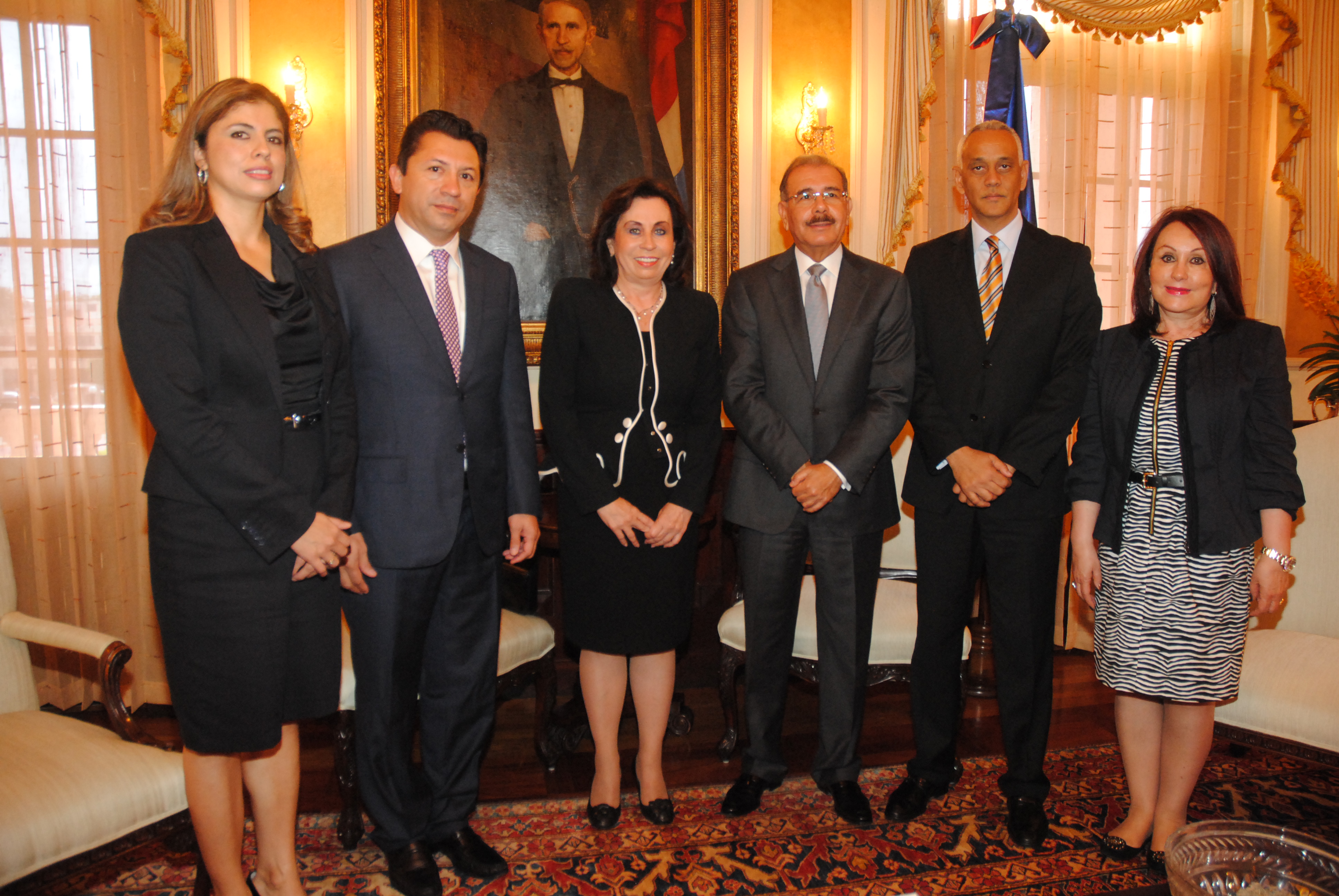 El presidente de la República Danilo Medina y la señora Sandra Torres, ex primera dama de la República de Guatemala, y actual secretaria general del Partido Unión Nacional de la Esperanza (PUNE), al posar durante la visita de cortesía realizada al despacho del Presidente. Dentro de la comitiva figura el ex presidente del Parlamento Centroamericano (Parlacen), Manolo Pichardo.