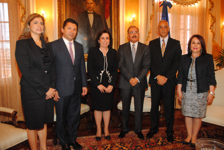 El presidente de la República Danilo Medina y la señora Sandra Torres, ex primera dama de la República de Guatemala, y actual secretaria general del Partido Unión Nacional de la Esperanza (PUNE), al posar durante la visita de cortesía realizada al despacho del Presidente. Dentro de la comitiva figura el ex presidente del Parlamento Centroamericano (Parlacen), Manolo Pichardo.