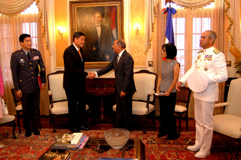 El presidente de la República Danilo Medina recibe saludos del ministro de defensa nacional de la República de China,Taiwán, capitán general (r) Kao Hua-Chu, en su despacho del Palacio Nacional.