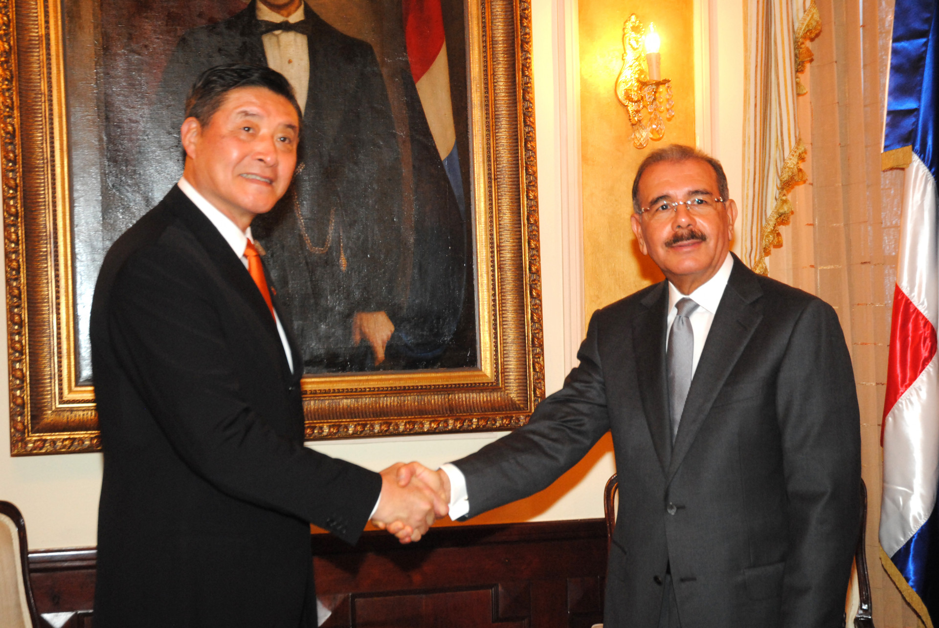 El presidente de la República Danilo Medina recibe saludos del ministro de defensa nacional de la República de China,Taiwán, capitán general (r) Kao Hua-Chu, en su despacho del Palacio Nacional.