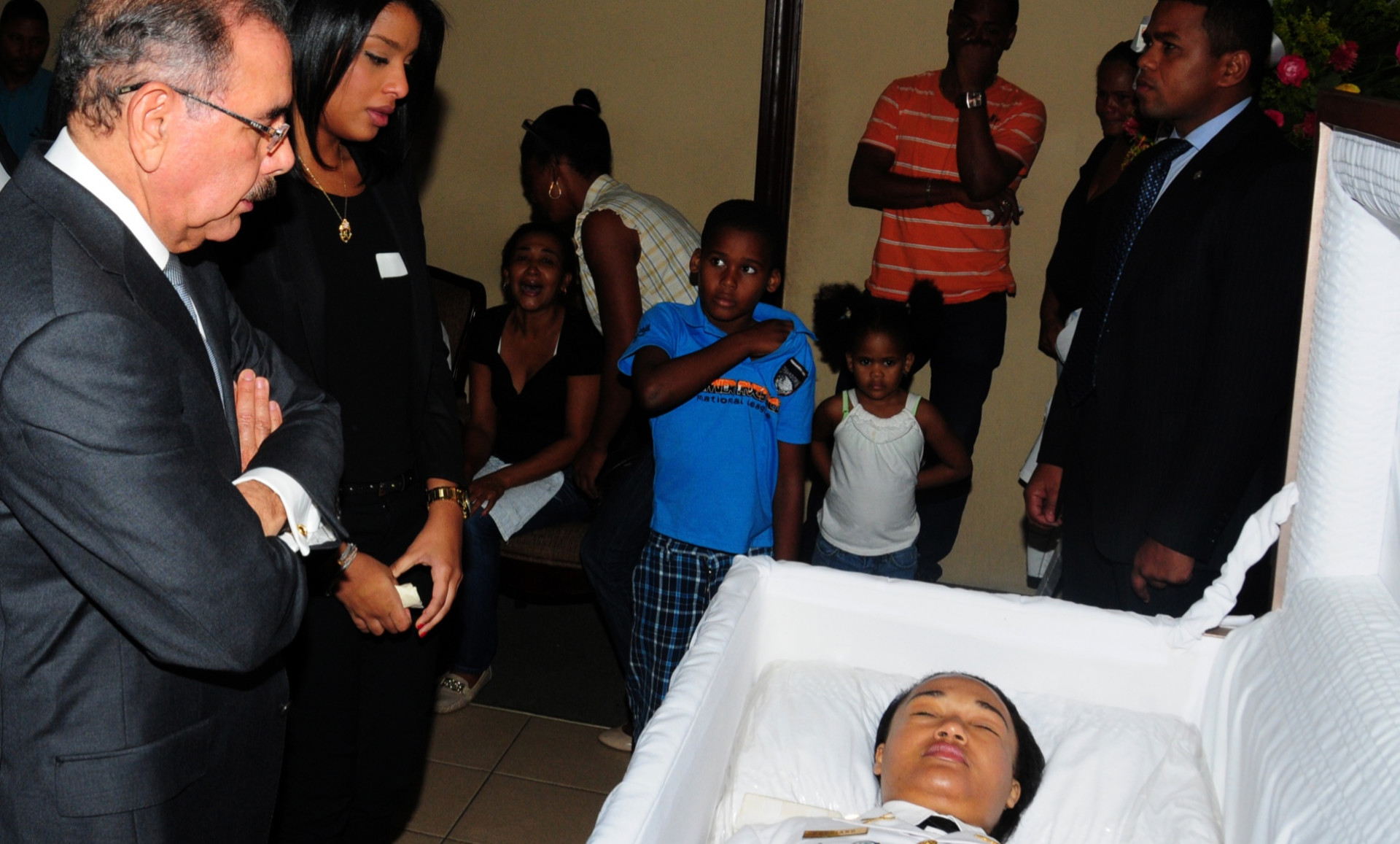 El presidente Danilo Medina acompañado de sus hijas Sibelly y Ana Paula Medina, al momento de aproximarse ante el féretro de la segundo teniente del Ejército Nacional, Zuleyca Ponciano Solano, en la Funeraria Blandino, de Santo Domingo Este, donde acudieron a dar el pésame a los familiares.