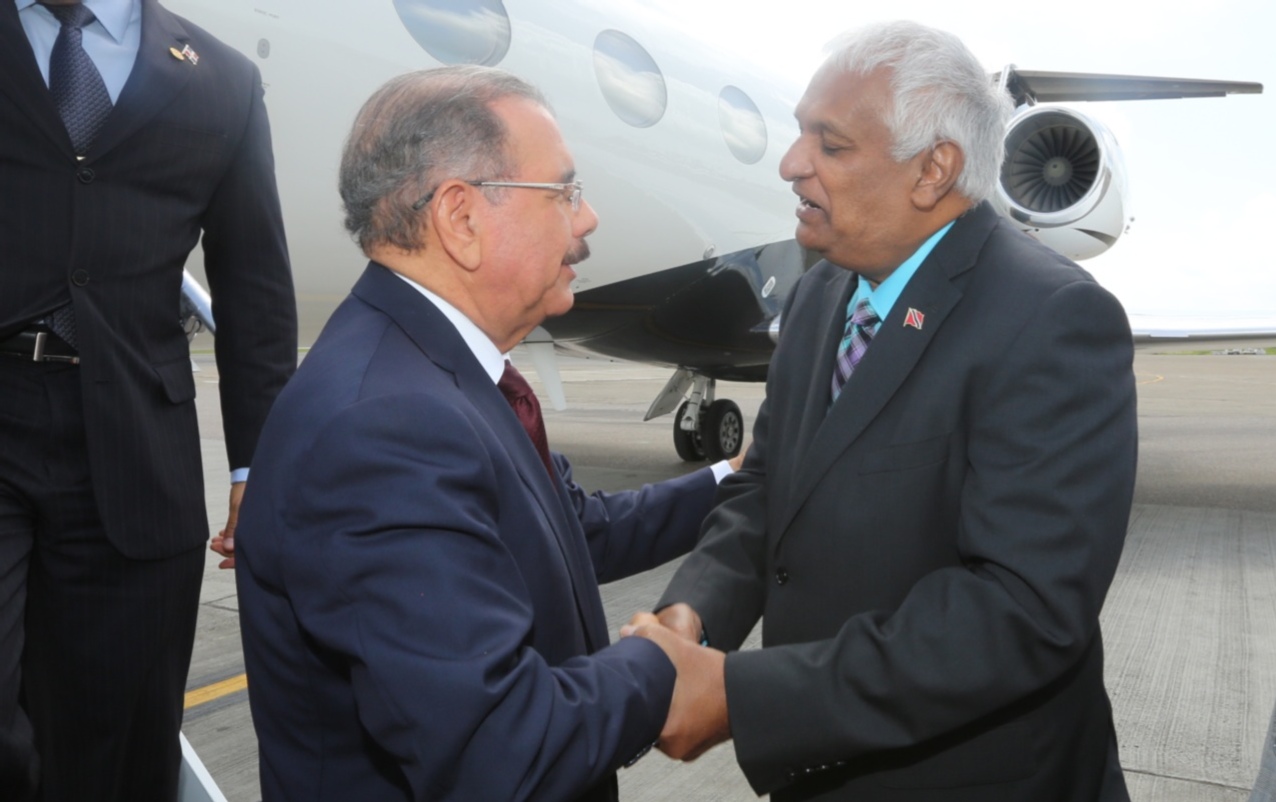 El presidente Danilo Medina al ser recibido por el ministro de Relaciones Exteriores de Trinidad y Tobago, señor Winston Dookeran; a su llegada al aeropuerto de Puerto España, donde asiste a la 34 Cumbre de CARICOM.