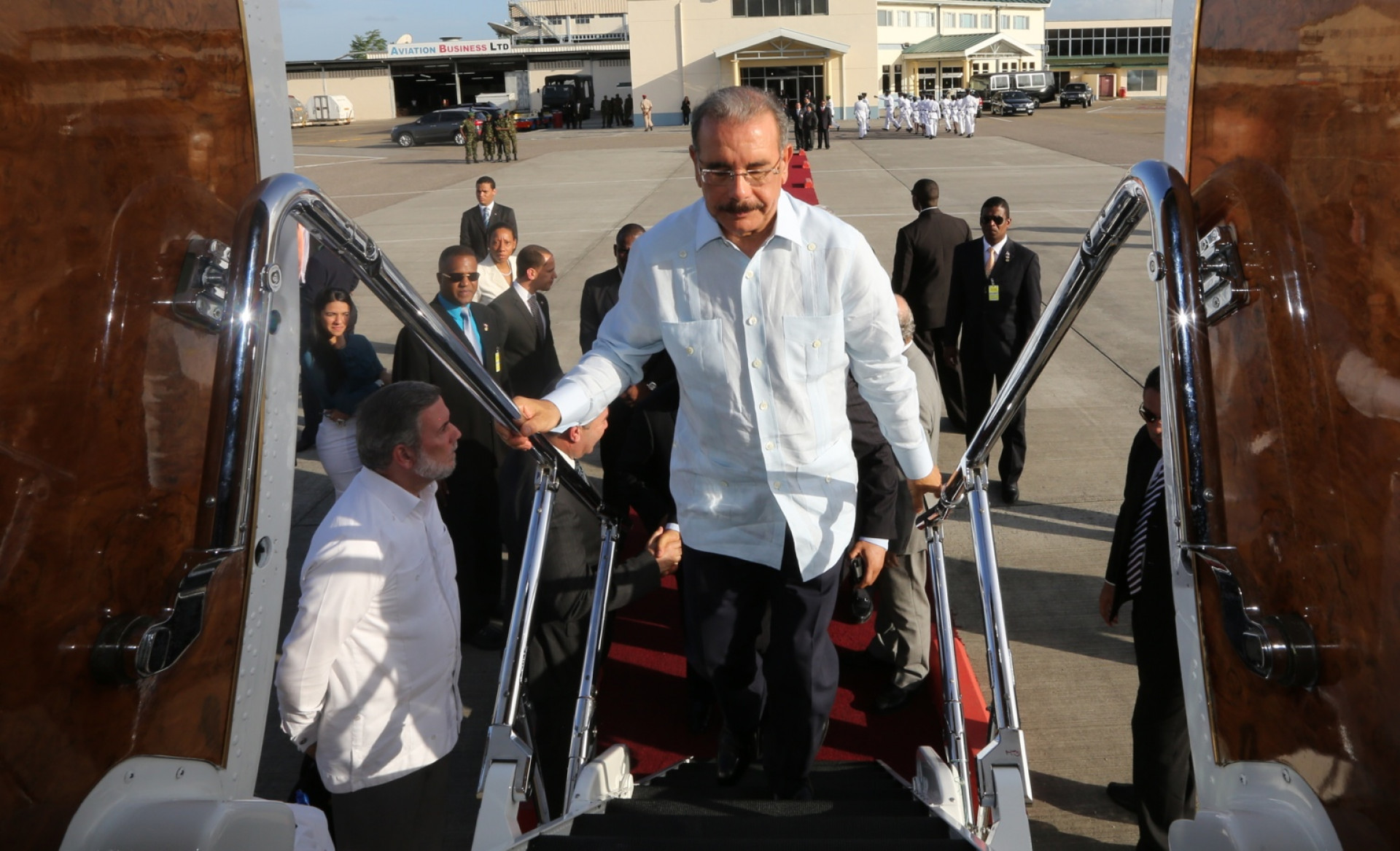 Presidente Medina ascendiendo las escalinata del avión para regresar al país, tras su participación en la actual 34 Cumbre de CARICOM, que se celebra en Puerto España, capital de las islas de Trinidad y Tobago.