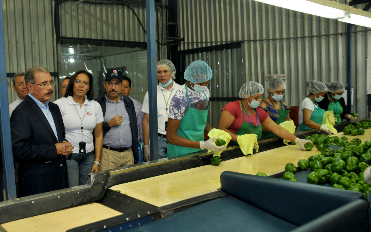 El presidente Danilo Medina recibe explicaciones de parte de directivos del clúster agropecuario HortiPack, sobre labores propias de empaques, durante su visita sorpresa a Constanza.