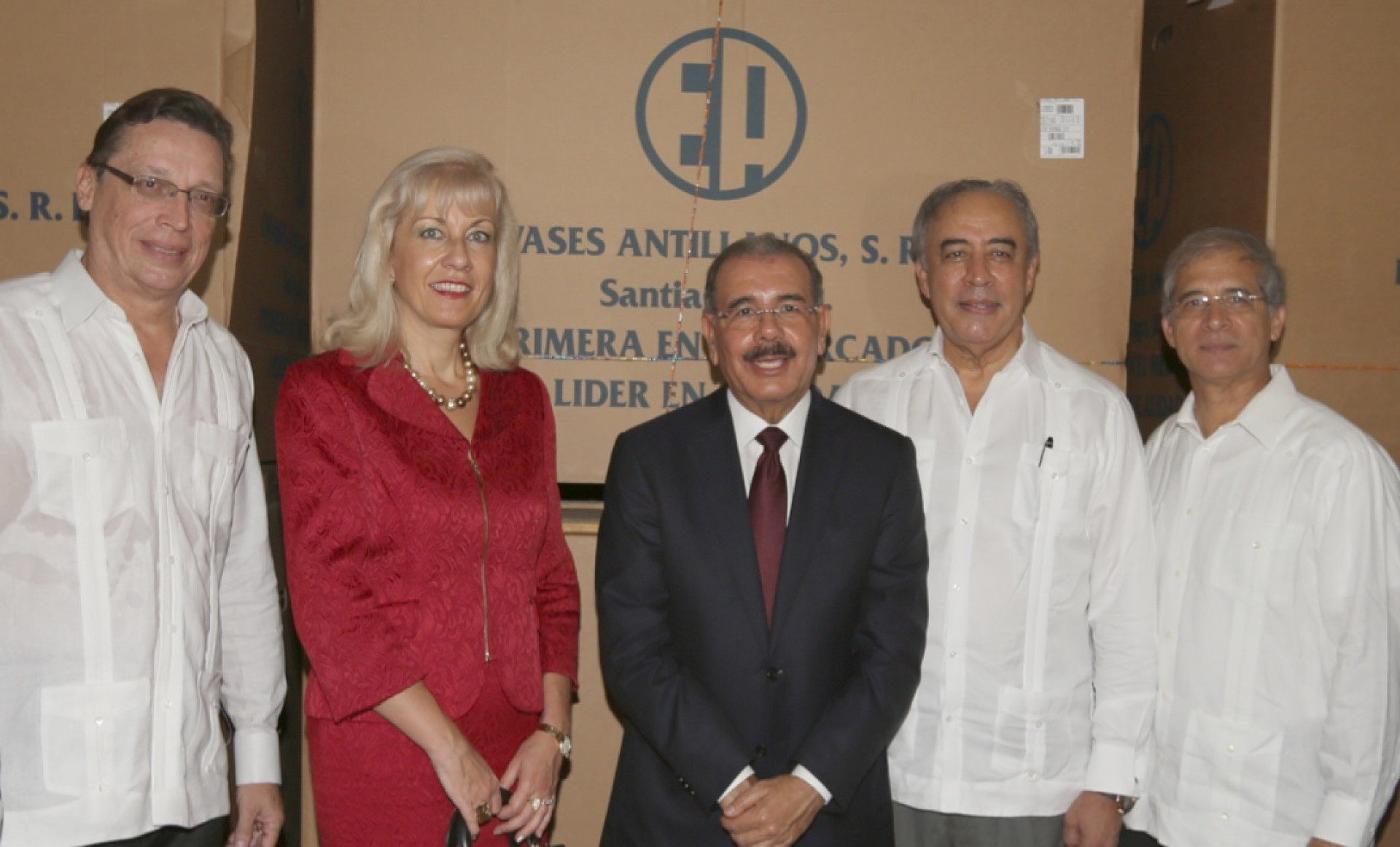 El presidente Danilo Medina, acompañado de la embajadora de Suiza en el país, Line-Marie León-Pernet; el presidente de la multinacional, Claude Mamboury, y otros empresarios, durante acto de inauguración de su nueva y moderna planta, ubicada en la ciudad de San Francisco de Macoris.