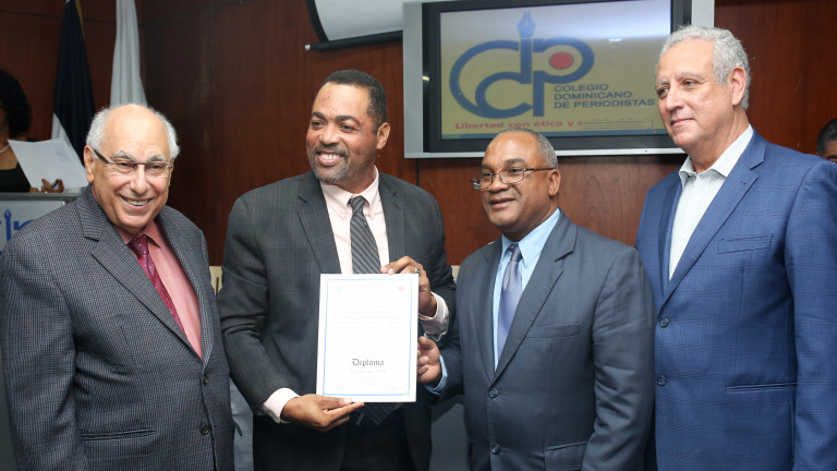 Uno de las participantes en en la jornada formativa recibe su certificado de participación, acompañado del ministro Miguel Mejía, el presidente del CD, Olivo de León; entre otras personalidades.