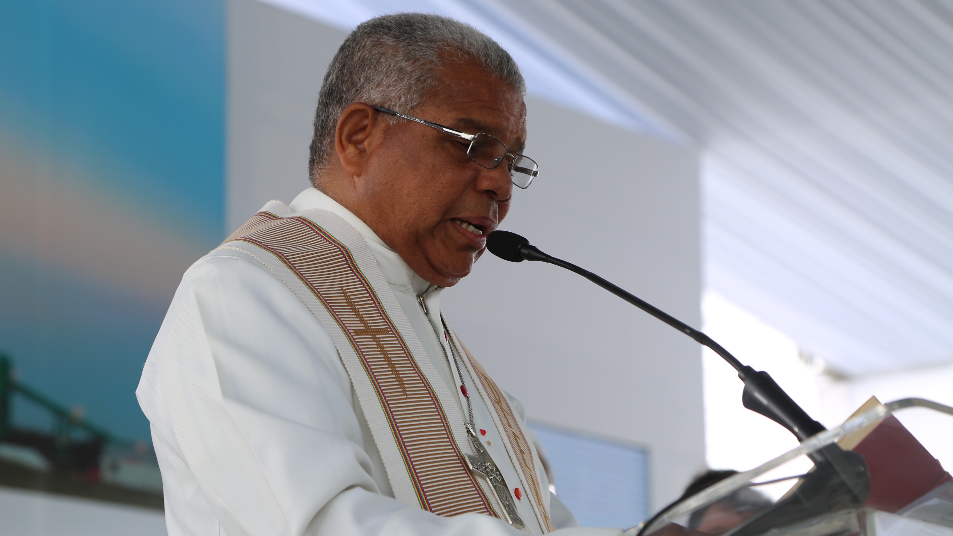 Monseñor Francisco Ozoria, obispo de la Diócesis de San Pedro. bendijo la obra al Inicio del acto de inauguración.
