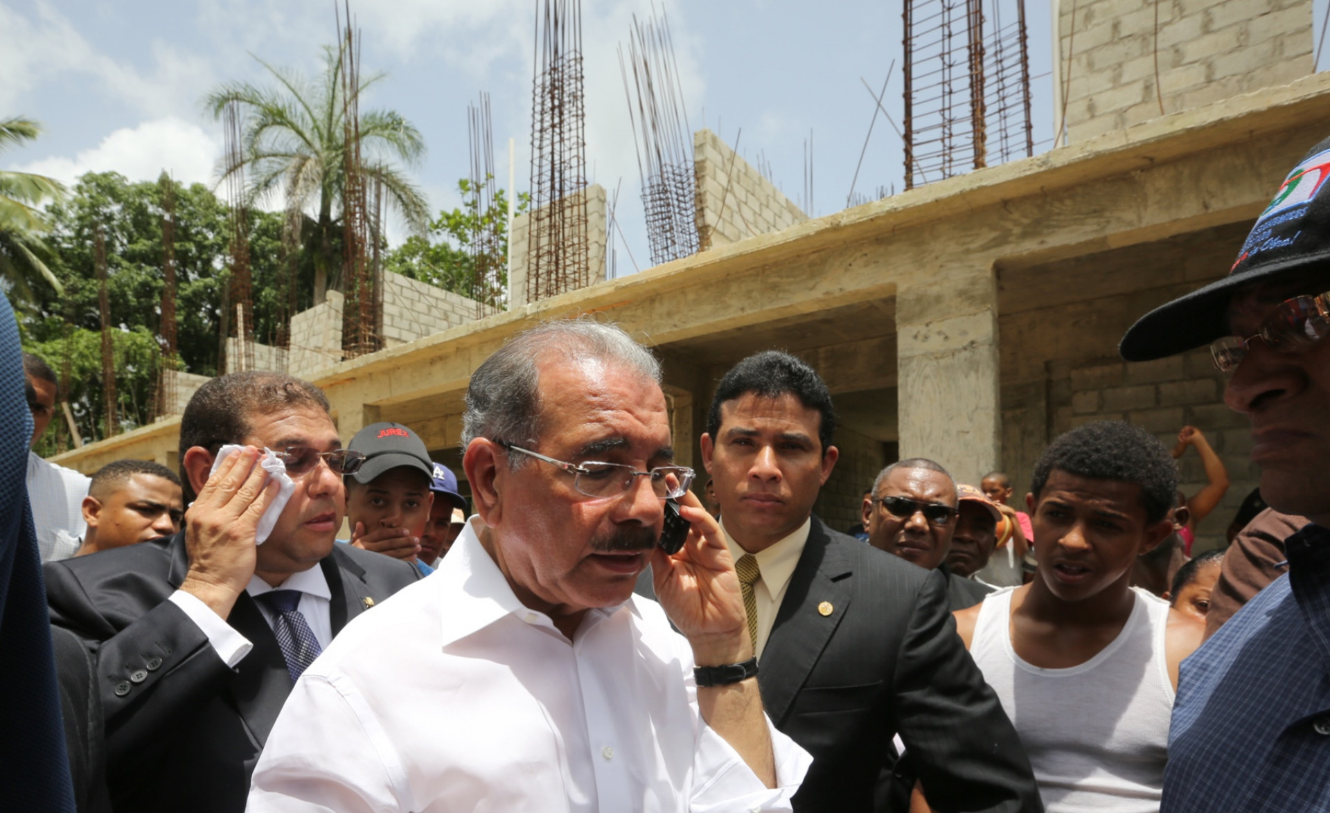 El presidente Danilo Medina al momento de llamar vía telefónica al ingeniero José Ernesto Peña, encargado de la construcción del Liceo Secundario Eugenio María de Hostos, en Arenoso, San Francisco de Macorís y ordenar el reinicio inmediato de la obra.
