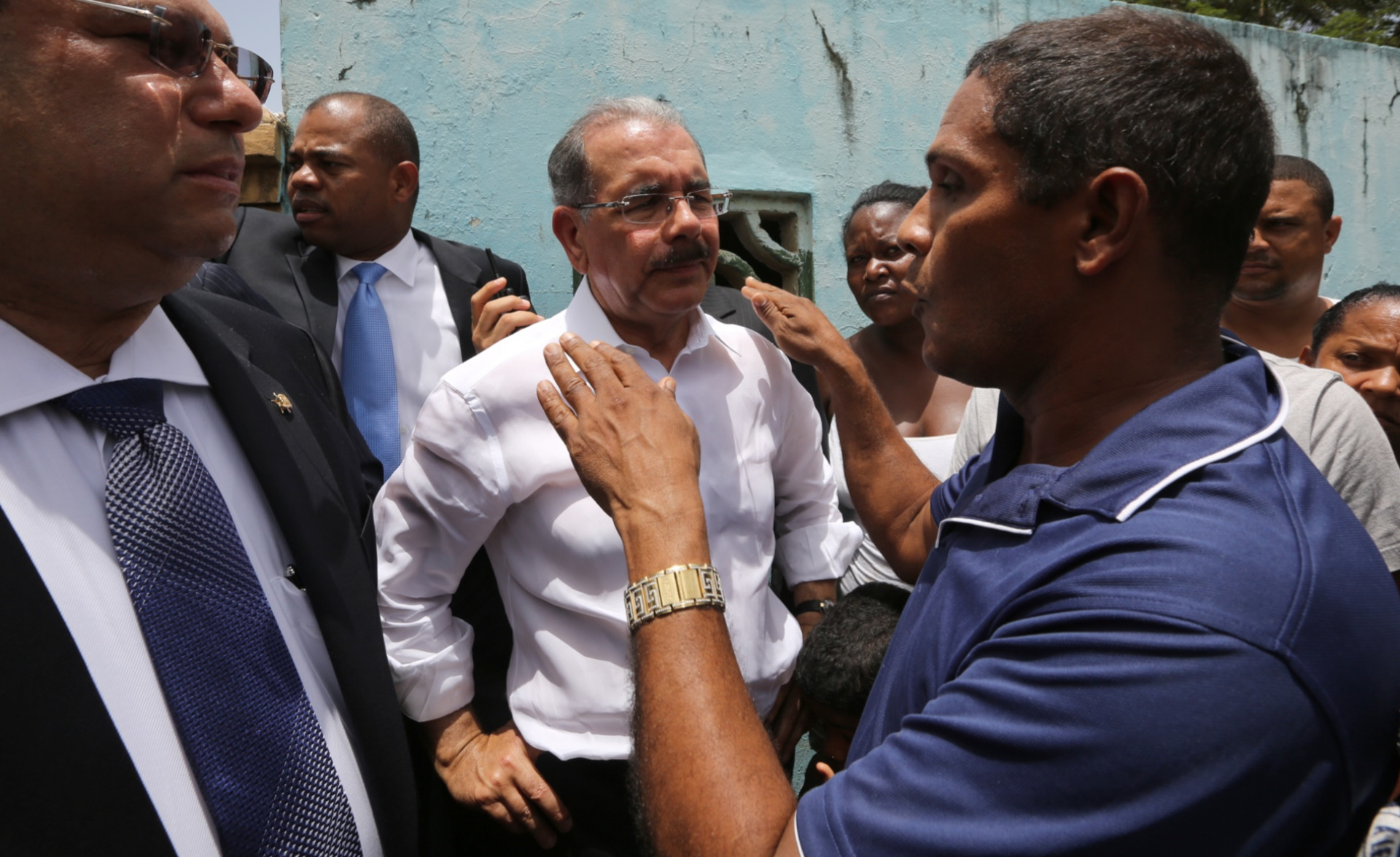 El presidente Danilo Medina junto a moradores de la zona, conversan sobre las principales necesidades de la comunidad de Arenoso, en San Francisco de Macorís, tras el paso de la tormenta Chantal, entre ellas la continuación de la construcción de su liceo secundario.