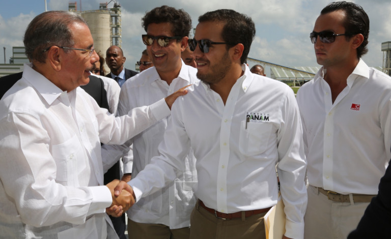 El presidente Medina al ser recibido por altos ejecutivos de Cemento PANAM, para el acto inaugural de la primera etapa de sus instalaciones, ubicadas en la comunidad Villa Gautier, municipio Los Llanos, provincia San Pedro de Macorís.