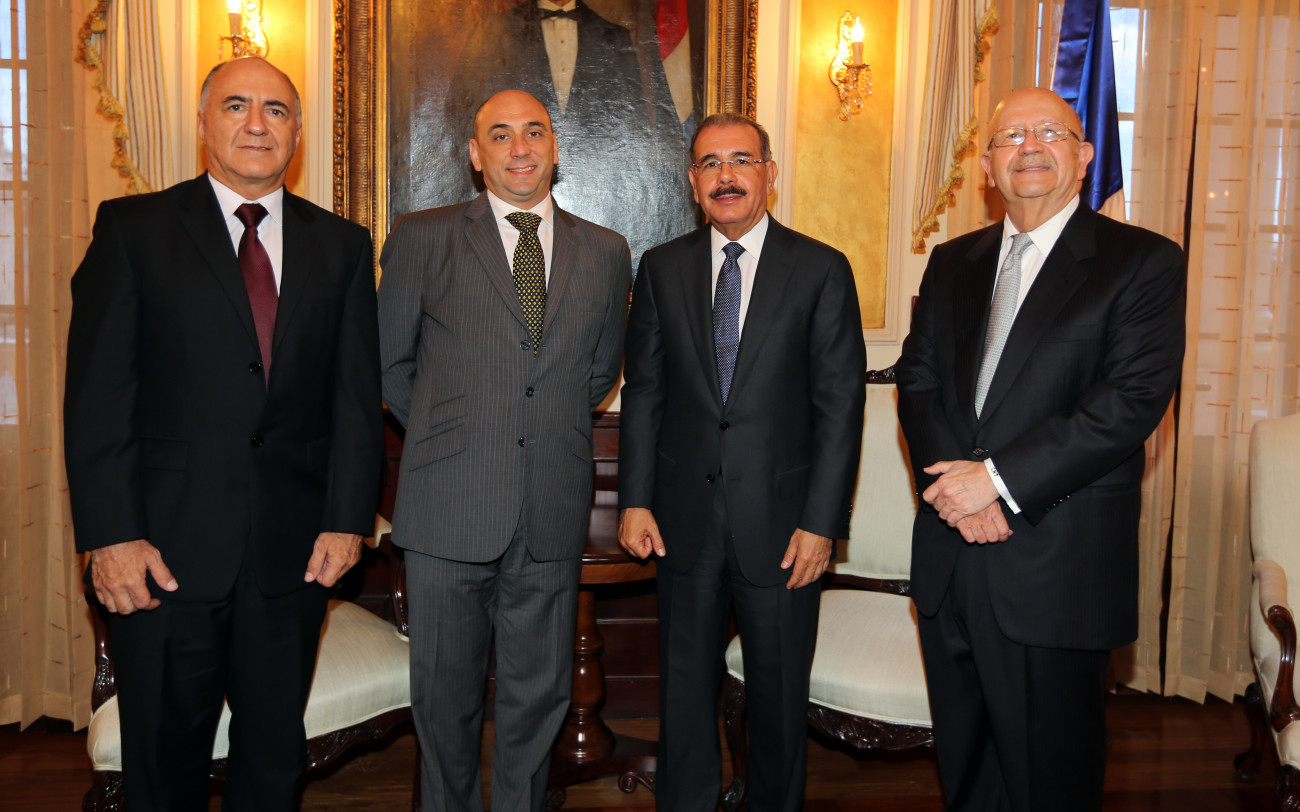 El presidente Danilo Medina junto a Lorenzo Jiménez de Luis, representante residente de la ONU; el ministro de Relaciones Exteriores, Carlos Morales Troncoso y el representante residente adjunto de las Naciones Unidas, Roberto Gálvez, al ser recibidos por el Mandatario hoy en su despacho del Palacio Nacional.