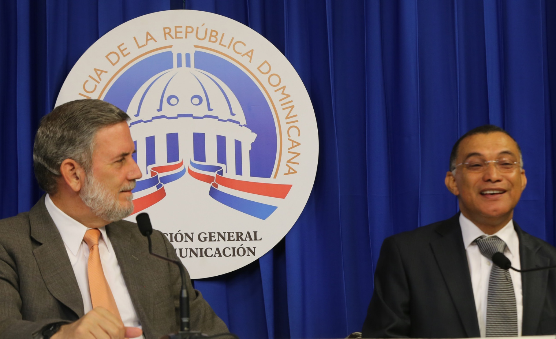 Roberto Rodríguez iguez Marchena, director de DICOM, junto al director general del Instituto Agrario Dominicano (IAD), Radhamés Valenzuela, en el Encuentro Semanal con los Medios, celebrado este lunes en el Palacio Nacional.