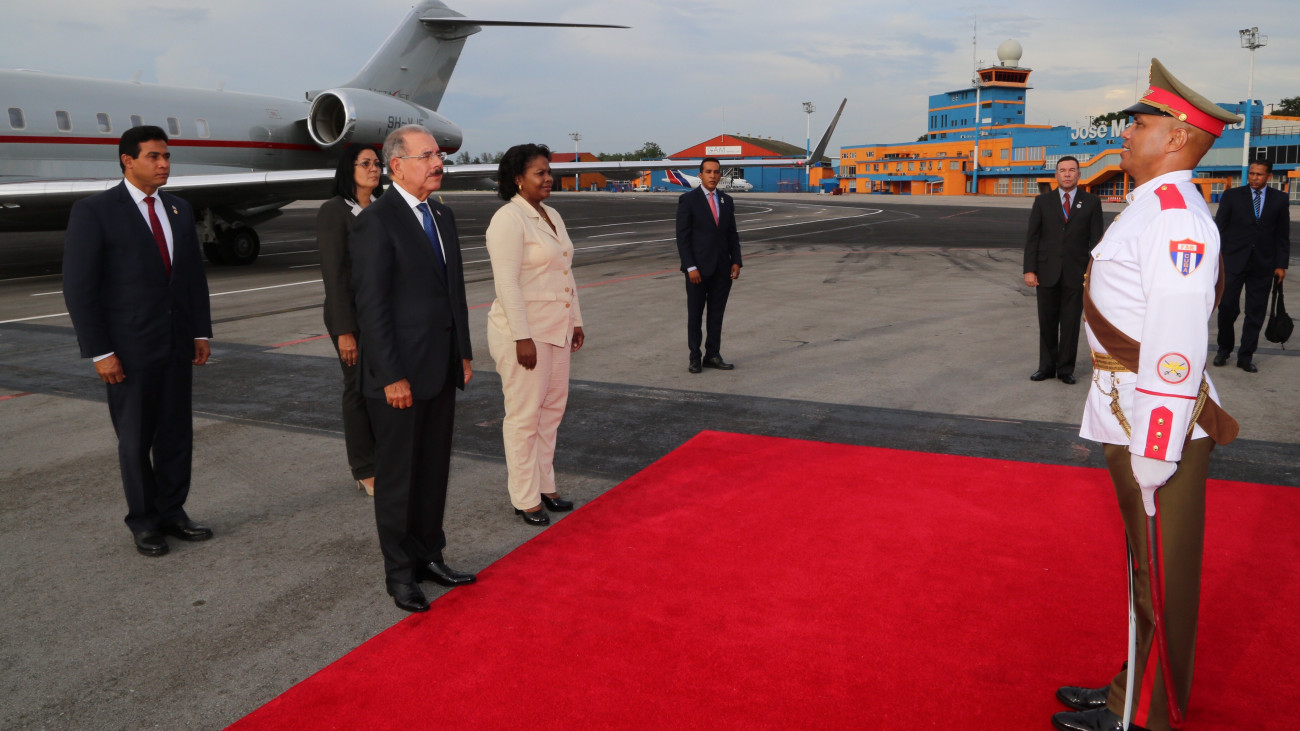 Llegada del presidente Danilo Medina a Cuba para participar en la VII Cumbre de Jefes de Estado y de Gobierno de la Asociación de Estados del Caribe (AEC). Fue recibido en el Aeropuerto Internacional José Martí, por Yaranis Armenteros Medina, miembra del Consejo de Estado de Cuba; Joaquín Gerónimo, embajador dominicano en Cuba, y Pedro Gómez, director del Ceremonial y Protocolo de Estado.