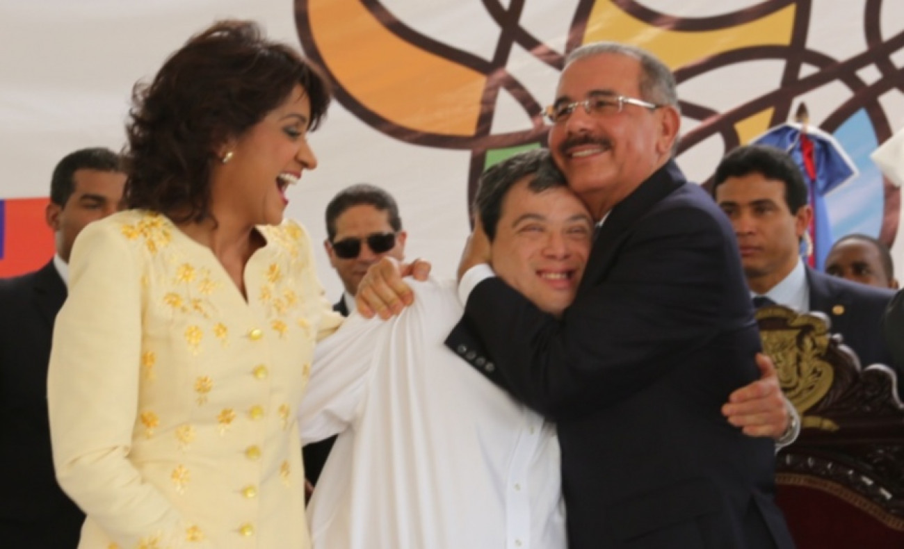El presidente Danilo Medina acompañado de su esposa, la primera Dama Cándida Montilla de Medina, mientras saludan un de los jóvenes participantes en la recepción por inicios de construcción del Centro de Atención Integral para la Discapacidad (CAID), en Santiago.