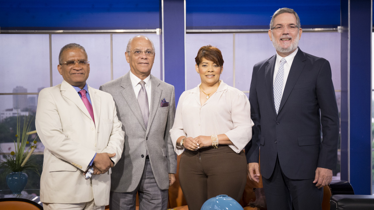 Roberto Rodríguez Marchena acompañado de los comunicadores Ramón Puello Báez, Geraldino González y Ana Mercy Otáñez.