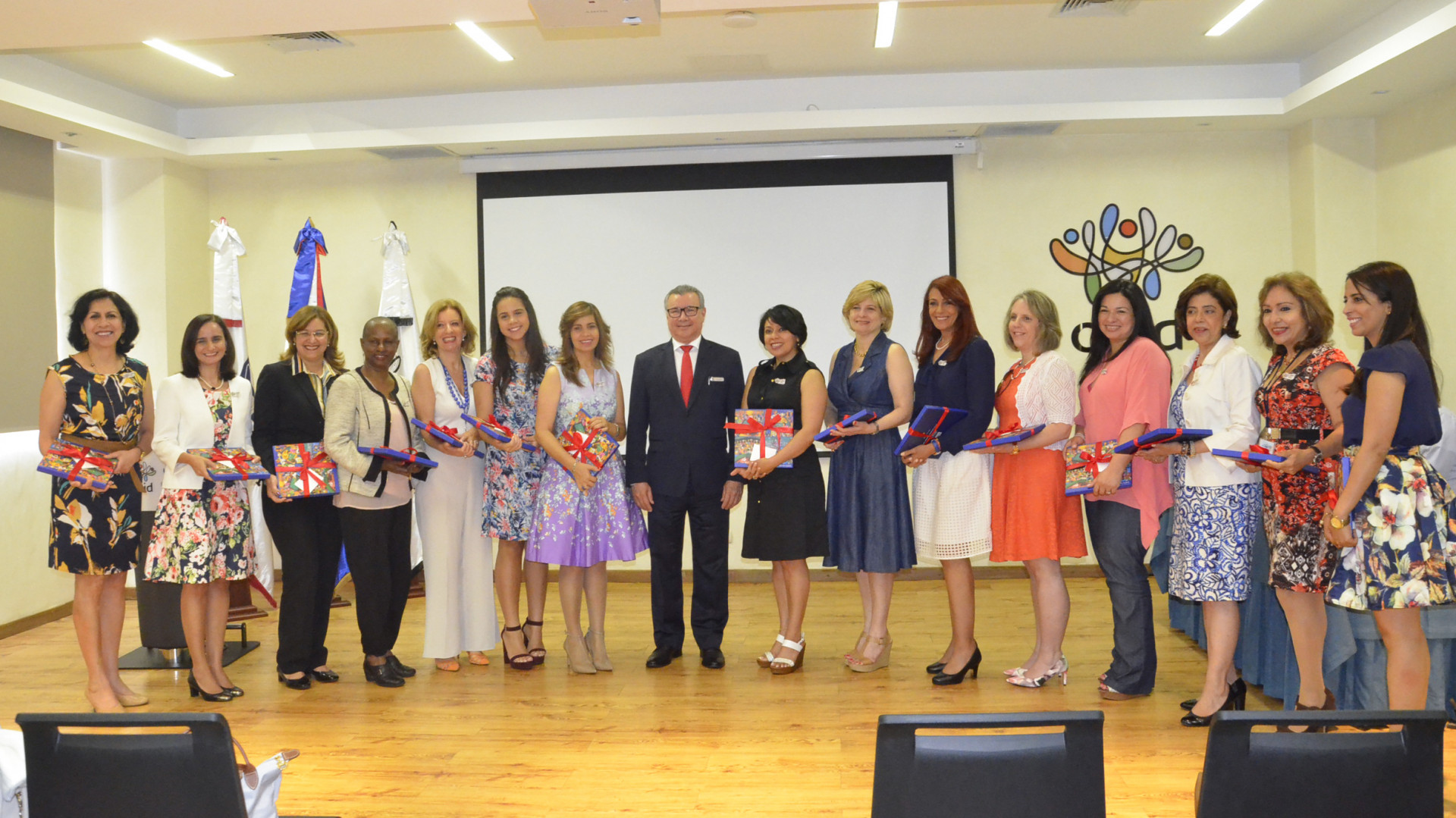 El grupo de esposas de jefes de delegaciones diplomáticas estuvieron acompañadas de una comisión criolla conformada por Diana Ureña, Gloria Polcastri Amat, las embajadoras Ada Hernández, Rosa María Nadal y América Velázquez, Amelia Navarro y como anfitriona María Luisa de Navarro, esposa del canciller dominicano, Andrés Navarro, durante su visita de cortesía a la institución.