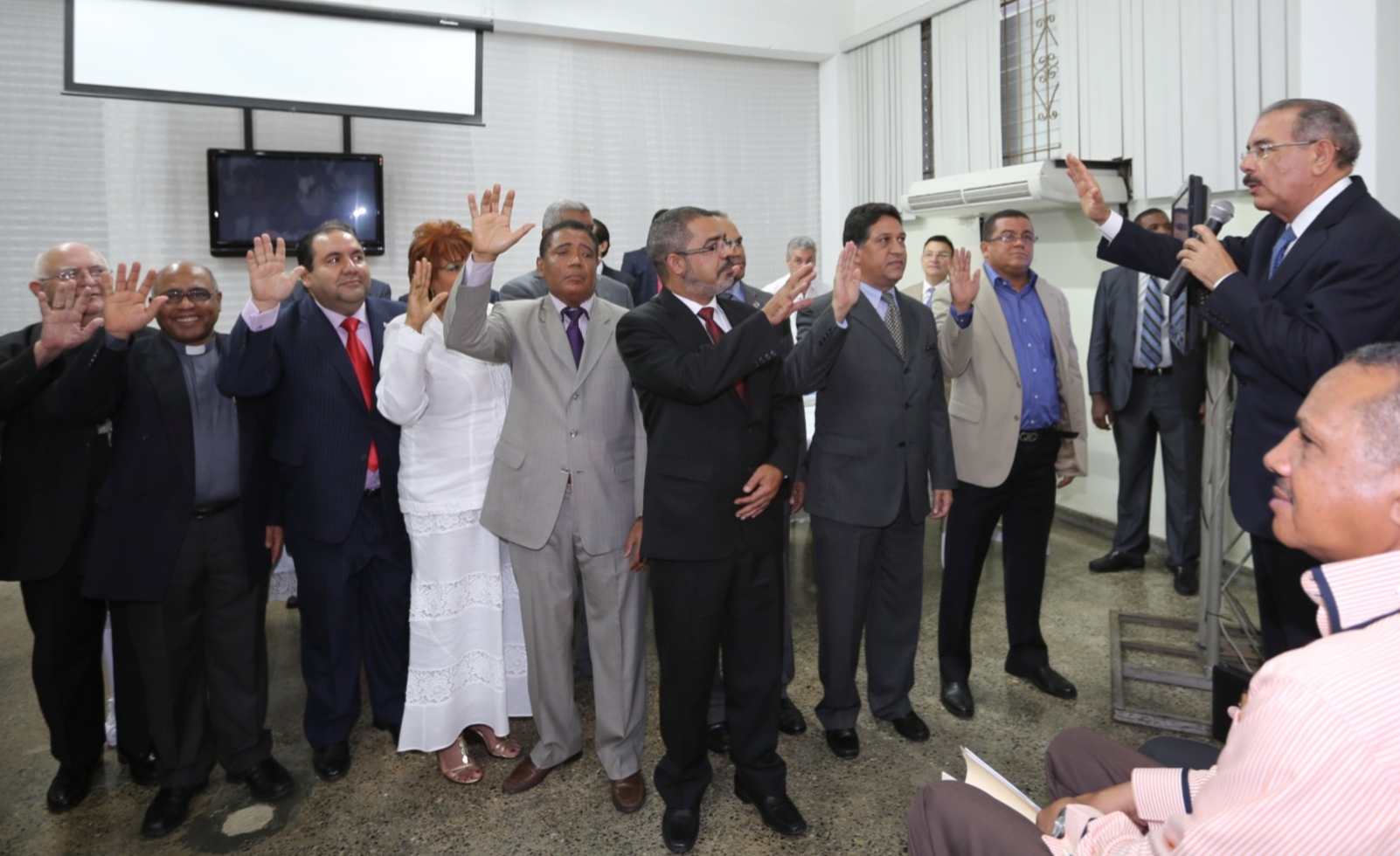 El presidente Danilo Medina visto mientra juramenta a los miembros del Consejo de Desarrollo Provincial, durante un acto celebrado en el Instituto Agronómico y Técnico Salesiano (IATESA), de la ciudad La Vega.