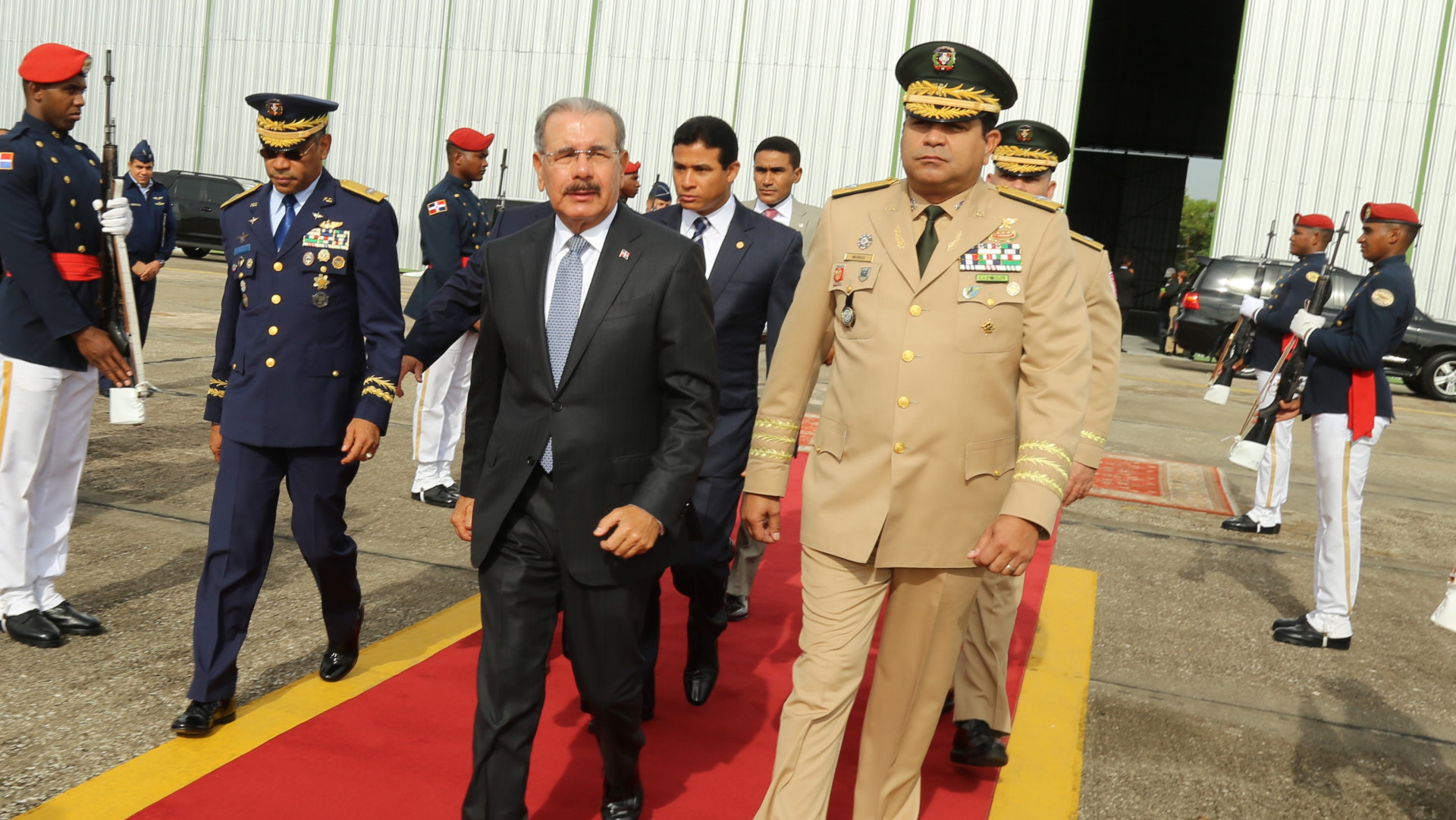 El presidente Danilo Medina camina acompañado del teniente general Máximo William Muñoz Delgado, quien acudió al Aeropuerto de la Base Aérea de San Isidro para despedir al mandatario.