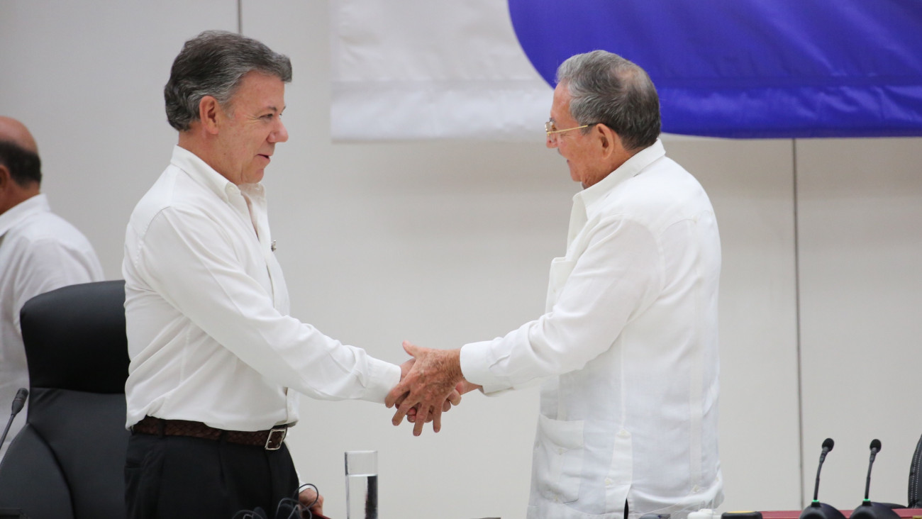 El General de Ejército Raúl Castro estrecha la mano al presidente de Colombia, Manuel Santos, durante la firma del acuerdo para el cese el fuego y hostilidades bilateral y definitivo.