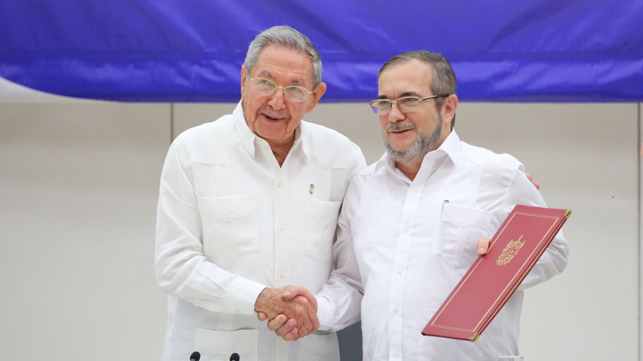 El General de Ejército Raúl Castro junto y el comandante de las FARC-EP, Timoleón Jiménez, tras la firma del acuerdo para el cese el fuego y hostilidades bilateral y definitivo.
