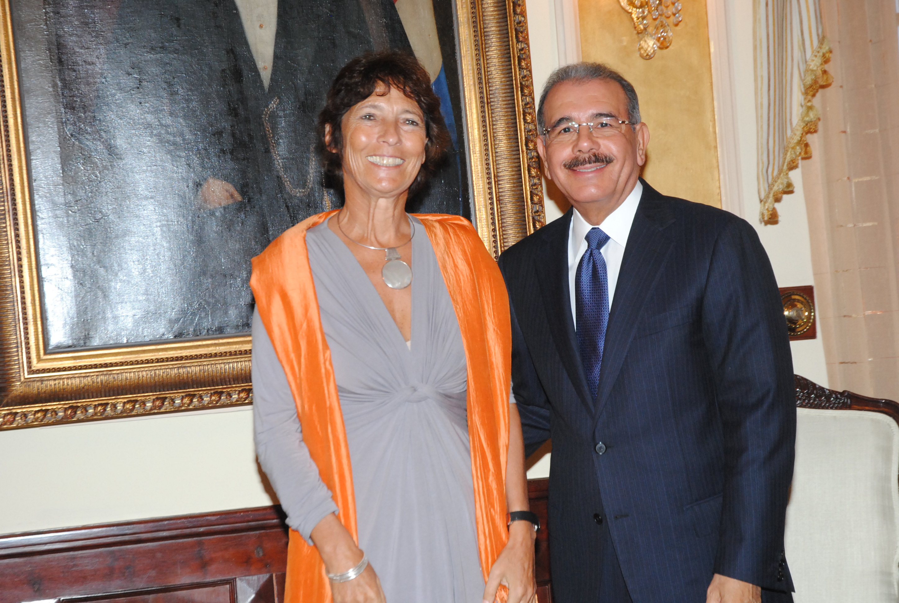 El presidente de la República, Danilo Medina y señora Irene Horejs, exjefa de la delegación de la Unión Europea para República Dominicana, durante su visita de cortesía, efectuada hoy al Palacio Nacional.