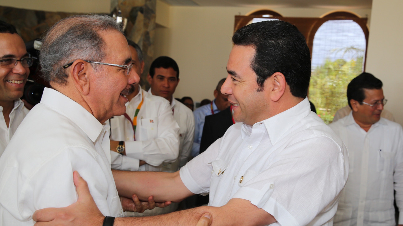 El presidente Danilo Medina y el presidente de Guatemala, Jimmy Ernesto Morales, en el marco de la celebración de la Reunión Ordinaria del SICA 2016, en Honduras.