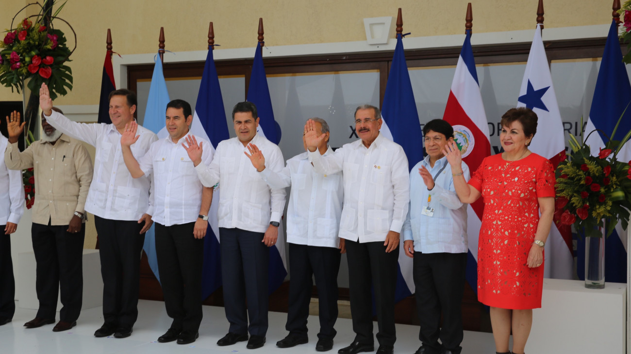 Foto oficial de participantes en la XLVII Reunión Ordinaria de Jefes de Estado y de Gobierno de los países miembros del Sistema de la Integración Centroamericana (SICA) 2016, celebrada en Isla Roatan, Honduras.