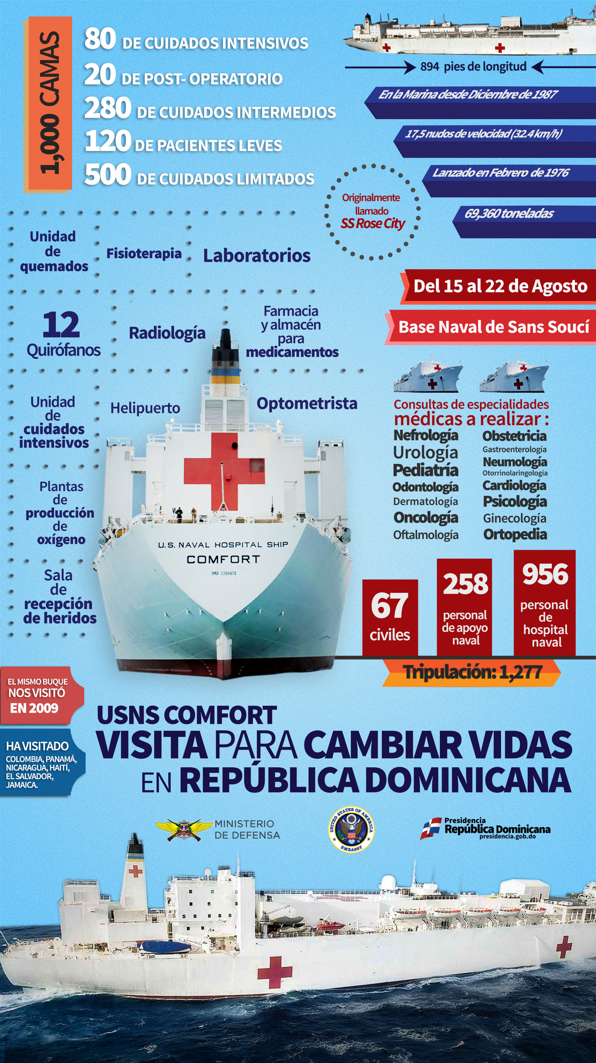 El Buque Hospital Comando de Transporte Marítimo Militar USNS COMFORT está en el país desde hoy y hasta el 23 de agosto, para dar asistencia médica a miles de dominicanos en necesidad, sumándose a los esfuerzos del Gobierno de atención en salud.