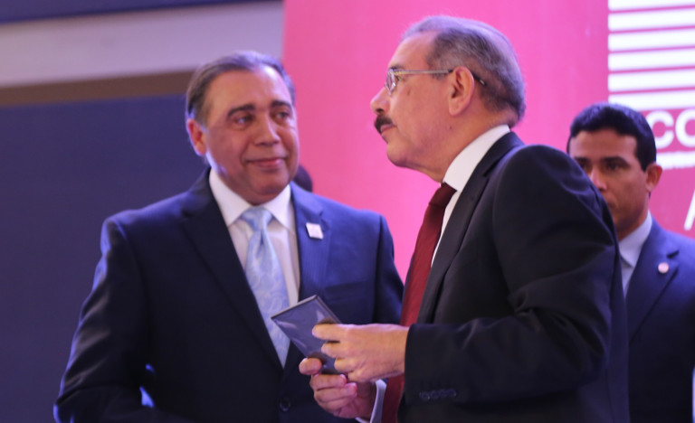 El presidente de la República, Danilo Medina y Fermín Acosta, presidente de Acoprovi, durante el acto de clausura de la Cuarta Mesa de la Vivienda auspiciada por la Asociación Dominicana de Constructores y Promotores de Viviendas, encabezado por el Mandatario.