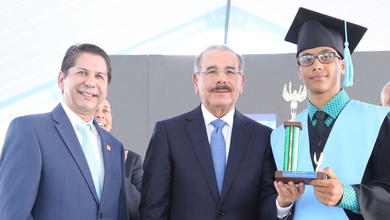 El presidente Danilo Medina y José Aníbal García Vargas, presidente de la Junta de Regentes del liceo científico, entregan el Premio Dr. Miguel Canela Lázaro, a estudiantes destacados.