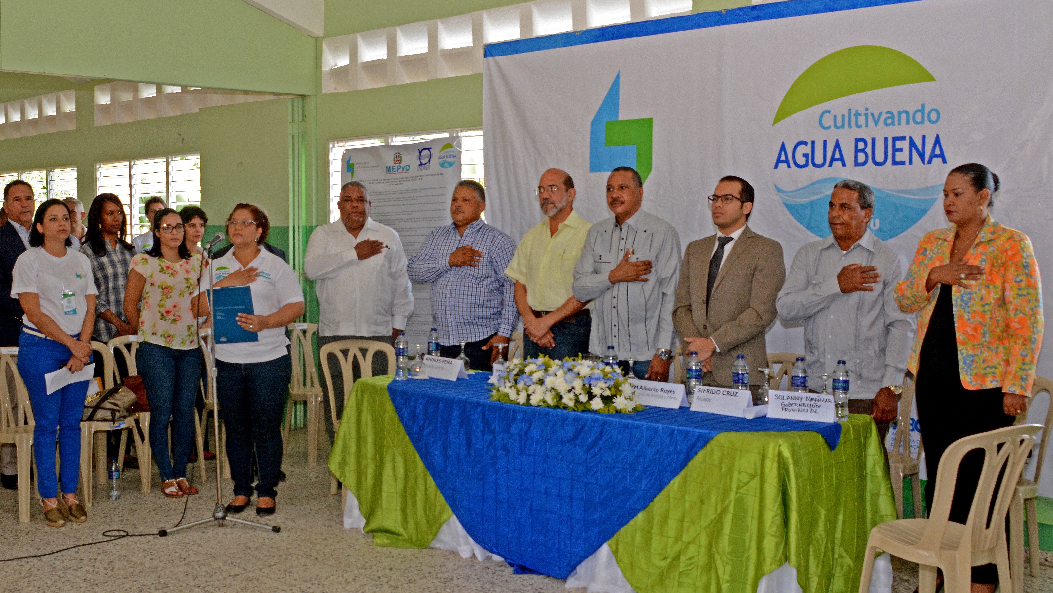 Participantes en la firma del “Pacto de las Aguas” en la microcuenca del Río Maimón, por unas 30 organizaciones comunitarias, estatales y de la sociedad civil, a través del programa Cultivando Agua Buena el Gobierno, celebrado en Juan Adrián, Bonao.